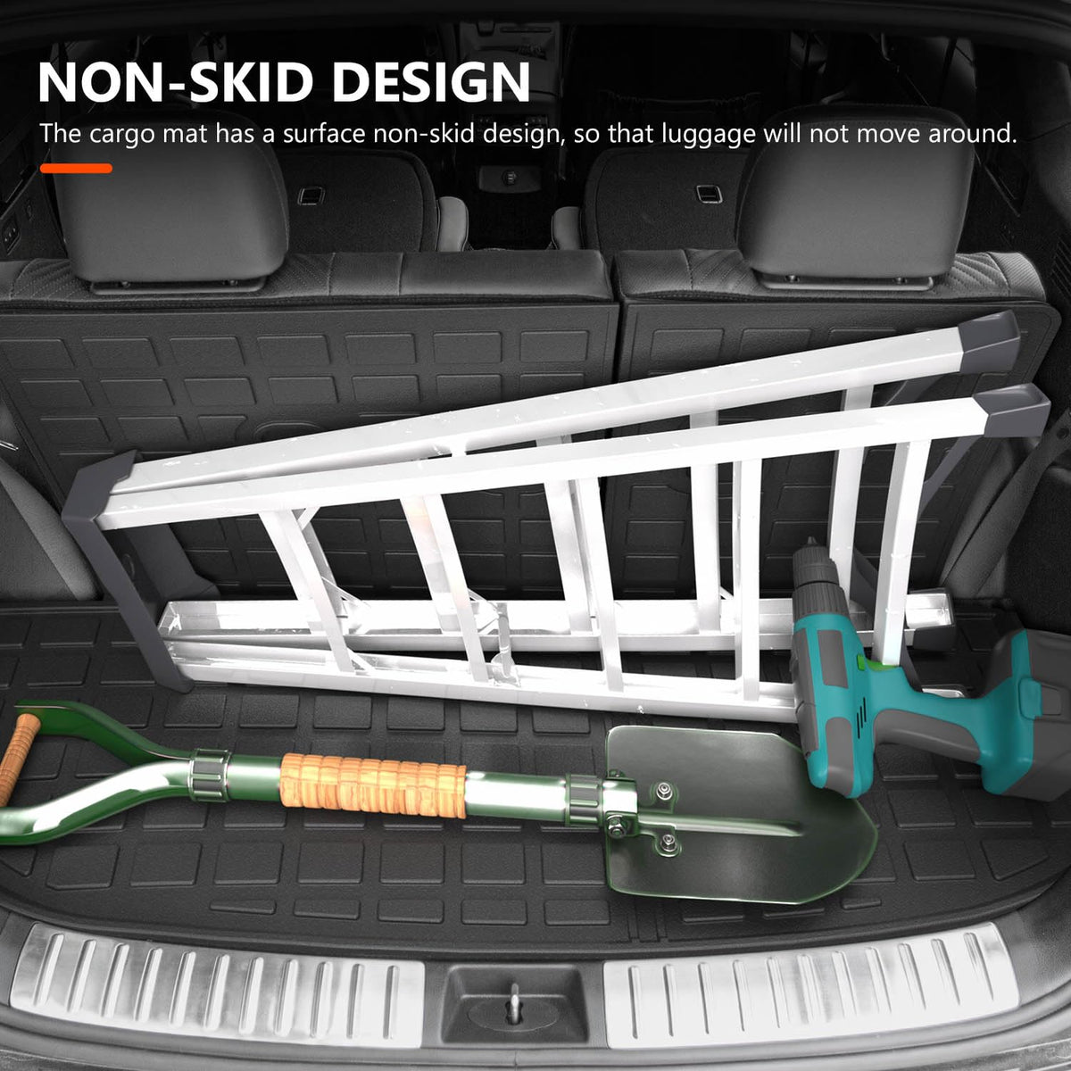 Q: How does the non-skid design of the Cargo Mat work?A: The non-skid design of the Cargo Mat ensures that items placed on it do not slide around during driving, providing a stable and secure area for your belongings.