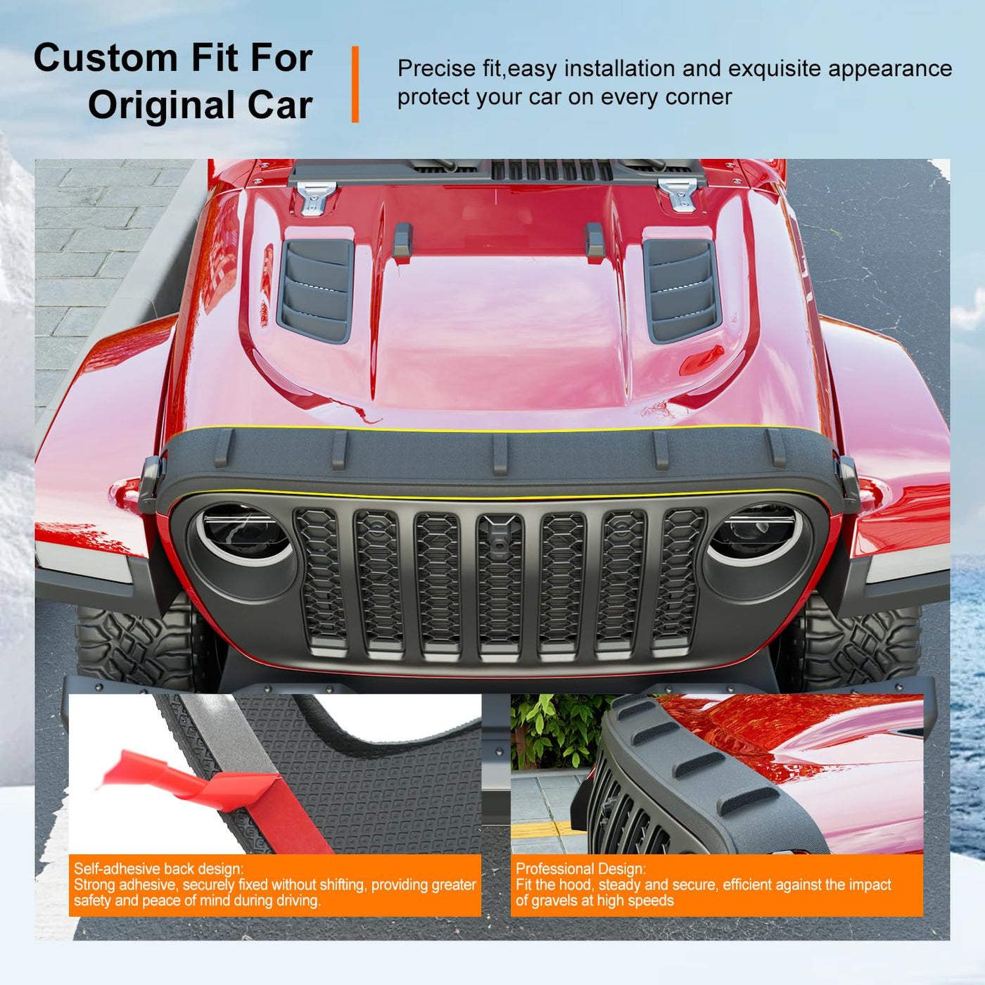 Custom Fitment:The deflector is compatible with 2020 2021 2022 2023 2024 2025 Jeep Gladiator JT hood deflector. It is also compatible with 2018 2019 2020 2021 2022 2023 2024 2025 Jeep Wrangler JL shield(Includes Unlimited & 4XE Models). It is designed according to the original car model. Please confirm the model and year before you buy it. Premium Material:The hood deflector compatible with 2020-2025 Jeep Gladiator JT hood protector is made of high quality TPE material, which is soft, scratch-resistant and has no bad smell. The special material makes it not easily deformed no matter how it is folded. At the same time, it also has the characteristics of waterproof, daily cleaning and maintenance only need to use a wet rag, saving time and effort. Multiple Function:The shield replacement for 2018-2025 Jeep Wrangler JL hood protector can effectively prevent dust or small stones from polluting the hood of your car, and even leave scratches, thus enhancing the safety of driving, regardless of wind and sun can be used outdoors for a long time. Special styling makes your car more fashionable and eye-catching, and makes your journey more exciting! Installation Recommendations:The installation of the deflector replacement for 2025 Gladiator JT hood shield is very easy. First, you need to clean the installation location, and then attach it to the correct position with the double-sided tape that comes with the product, the whole process is very simple. If you are worried that it is not strong enough, you can heat the double-sided tape with a hair dryer to enhance the stickiness. Do not touch water for 48 hours after installation. Satisfied Service:If you have any questions about protector replacement for 2020 2021 2022 2023 2024 2025 Jeep Gladiator JL hood deflector, please contact us at any time. We are here to promptly solve the problem and offer you excellent after-sales service to meet your satisfaction.