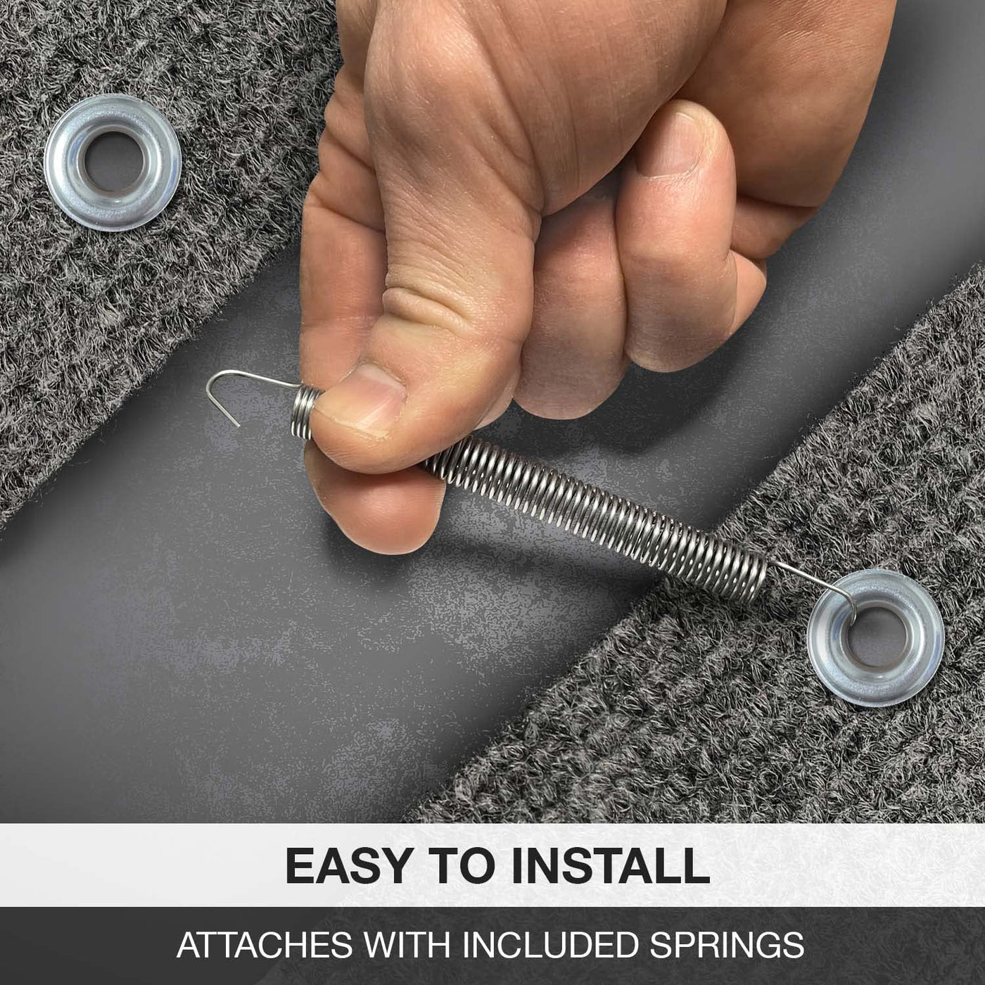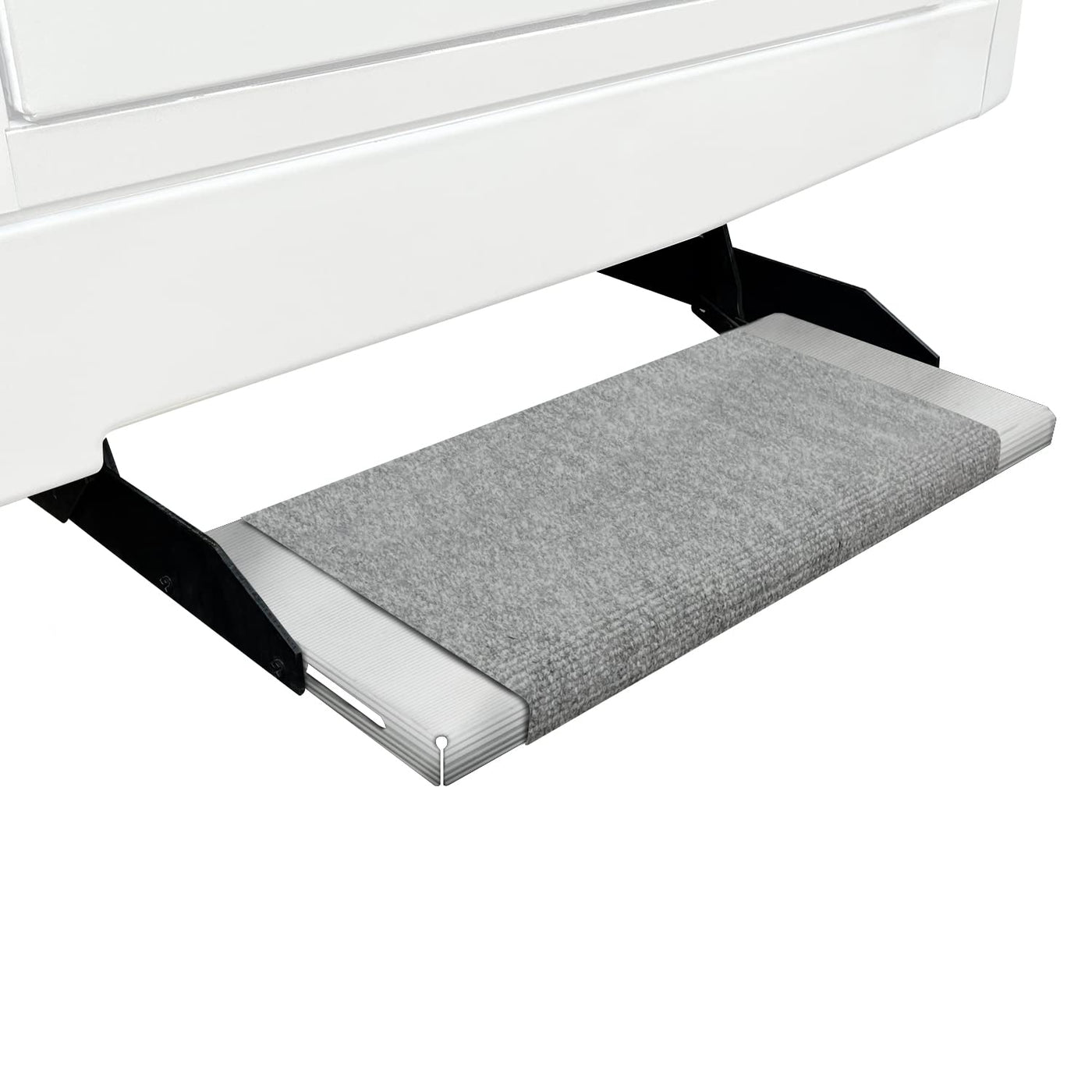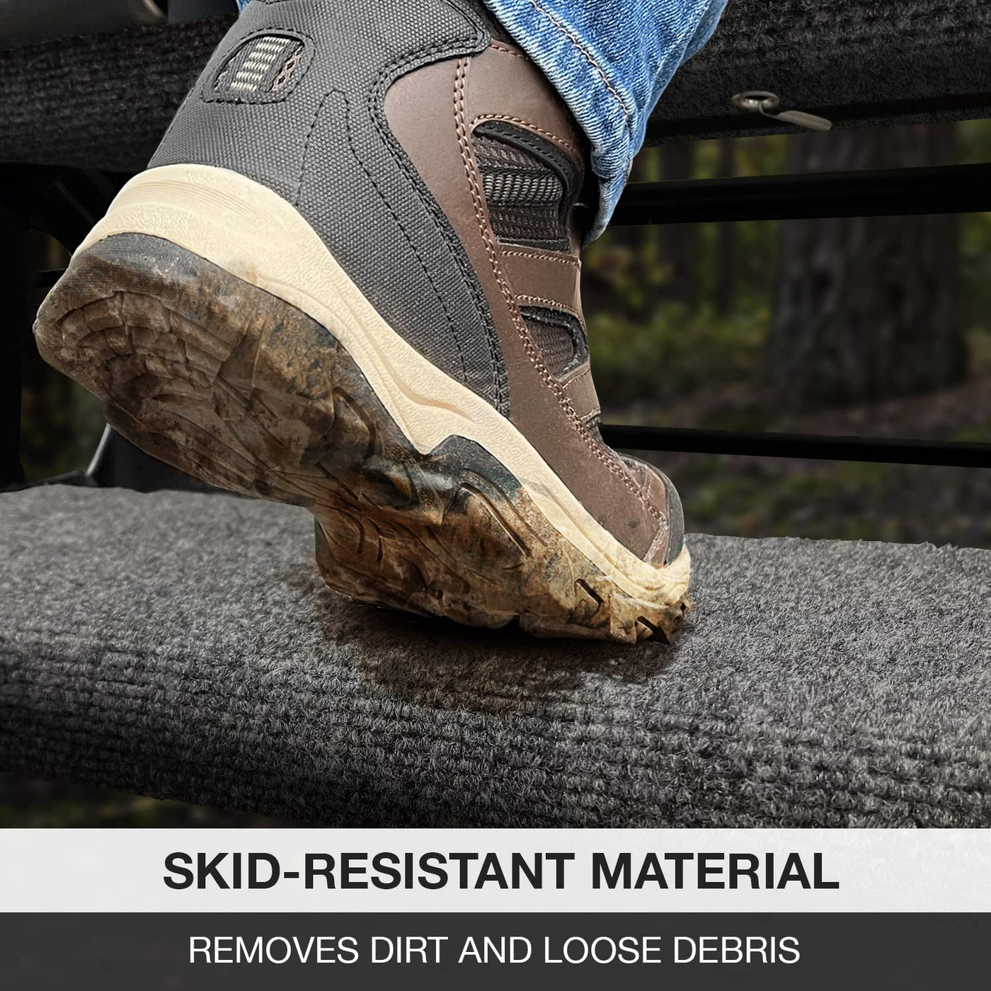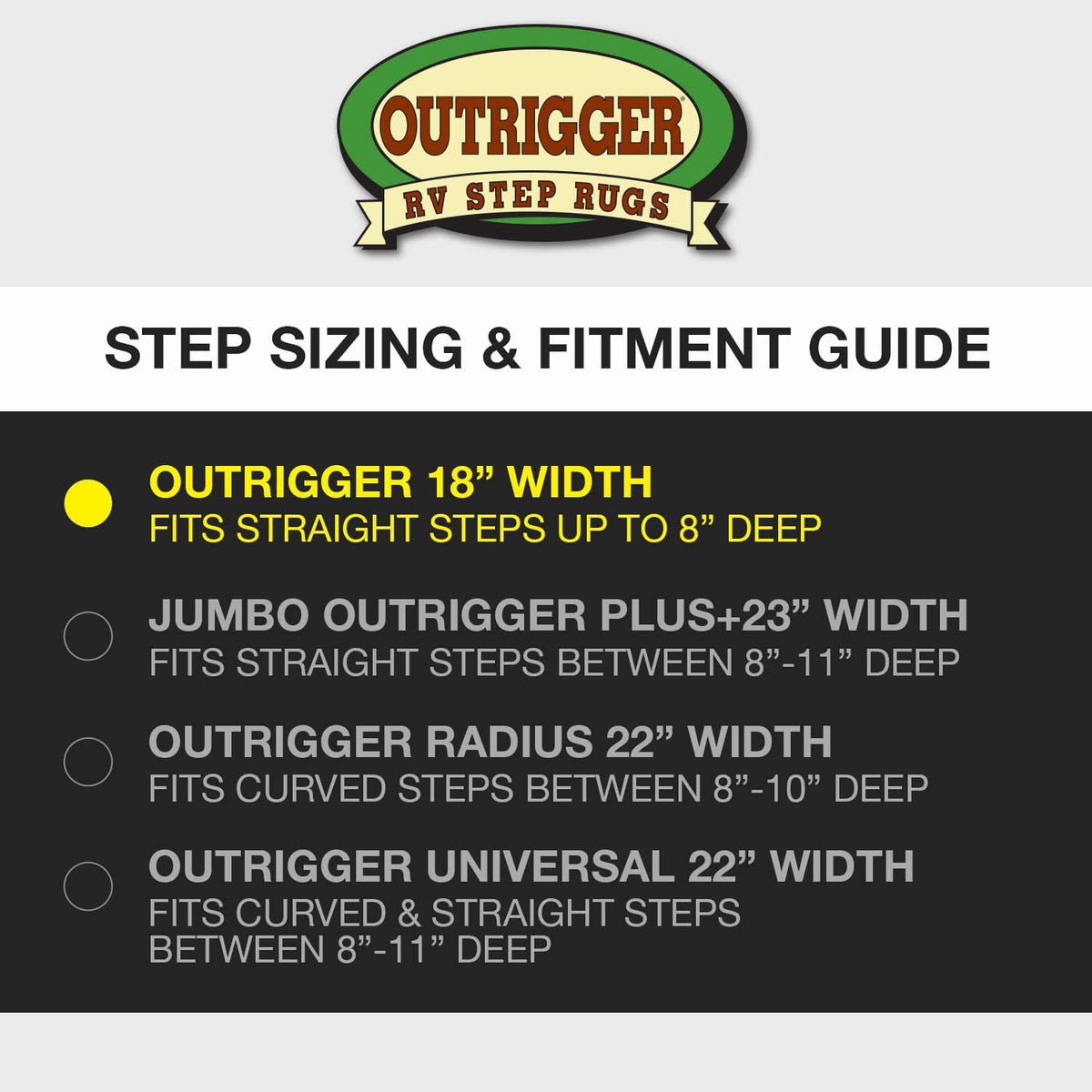Outrigger RV Step Rugs have a micro-ribbed texture to provide better traction. These step rugs are designed for straight RV steps. Easy to install with included springs fitting manual and electric steps up to 8 inches deep. Made of olefin carpet that is UV-protected against sun damage and fading. These step rugs are easy to clean, simply hose off and dry.