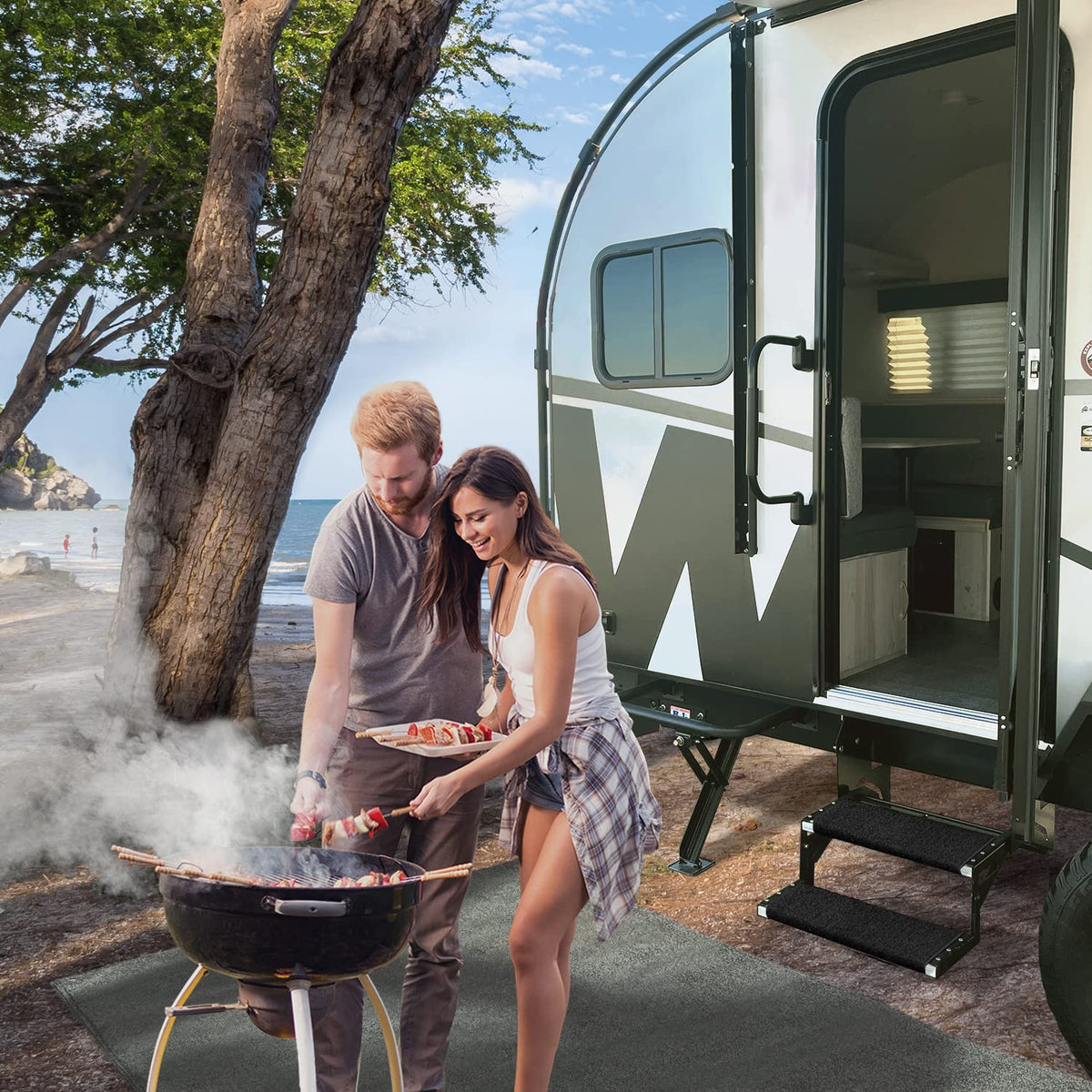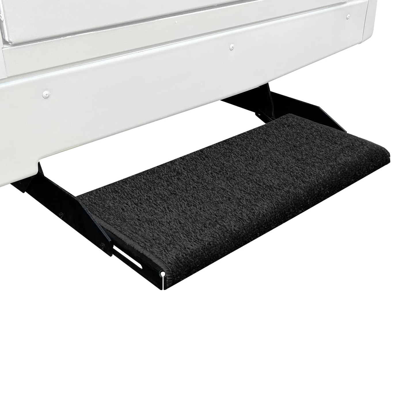 Black, 20 Inch Wide. Wraparound brand RV step Rugs protect your interior while accenting your exterior. Each durable, weather resistant rug is made of easy-to-clean UV-protected outdoor turf with marine backing. Easy to install, fitting most manual and electric steps with springs included. Available for straight and radius RV steps in a variety of sizes and colors.