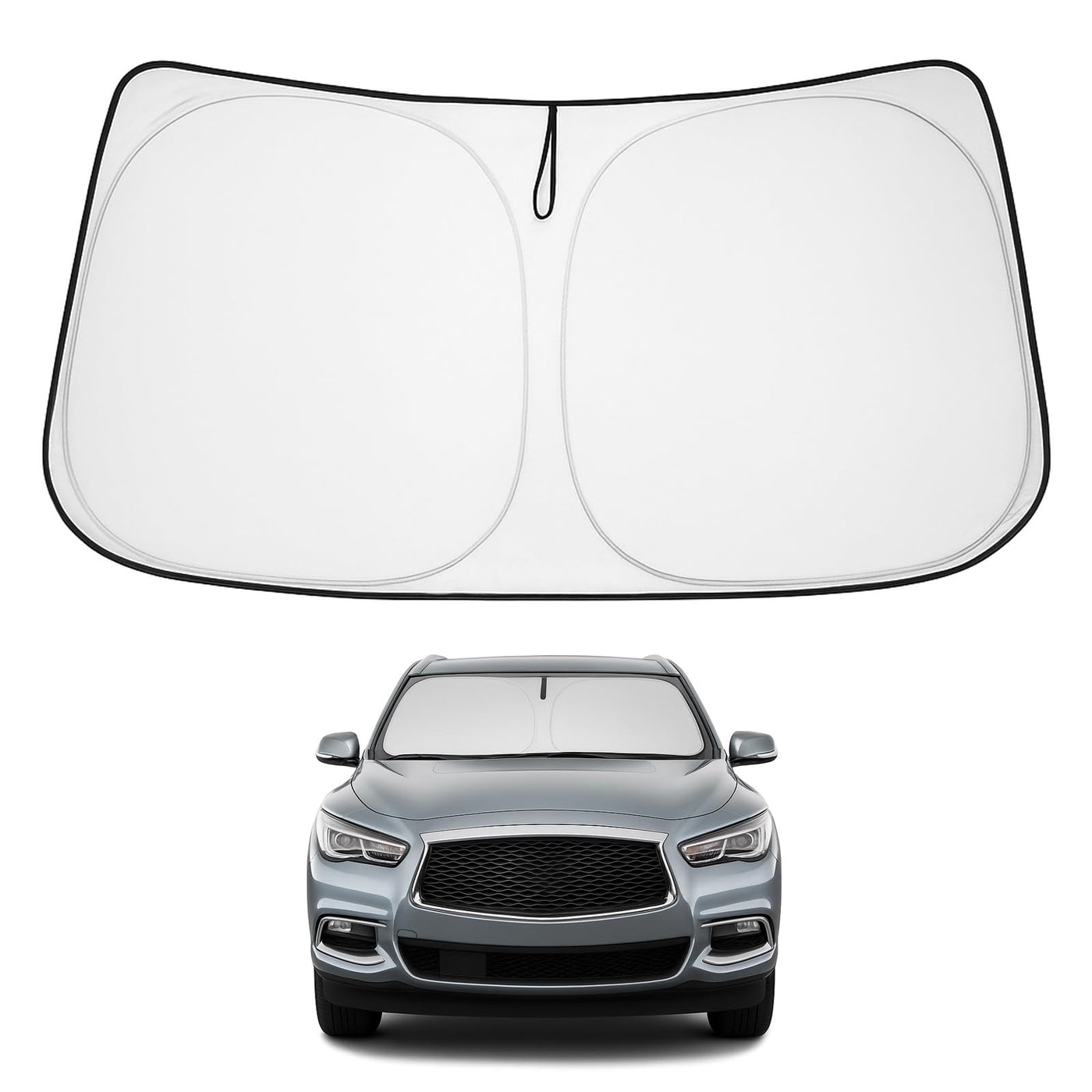 DESIGNED IN USA!!! Custom Design: The front windshield shade has been custom cut specifically for Infiniti QX60. Precise fit design and Reinforced steel rings make a precise and secure fit to the window, no need to use suction cups to hold it in place. It won't sag or collapse like other car heat shields. Fits all Infiniti QX60 2014 2015 2016 2017 2018 2019 2020 2021.