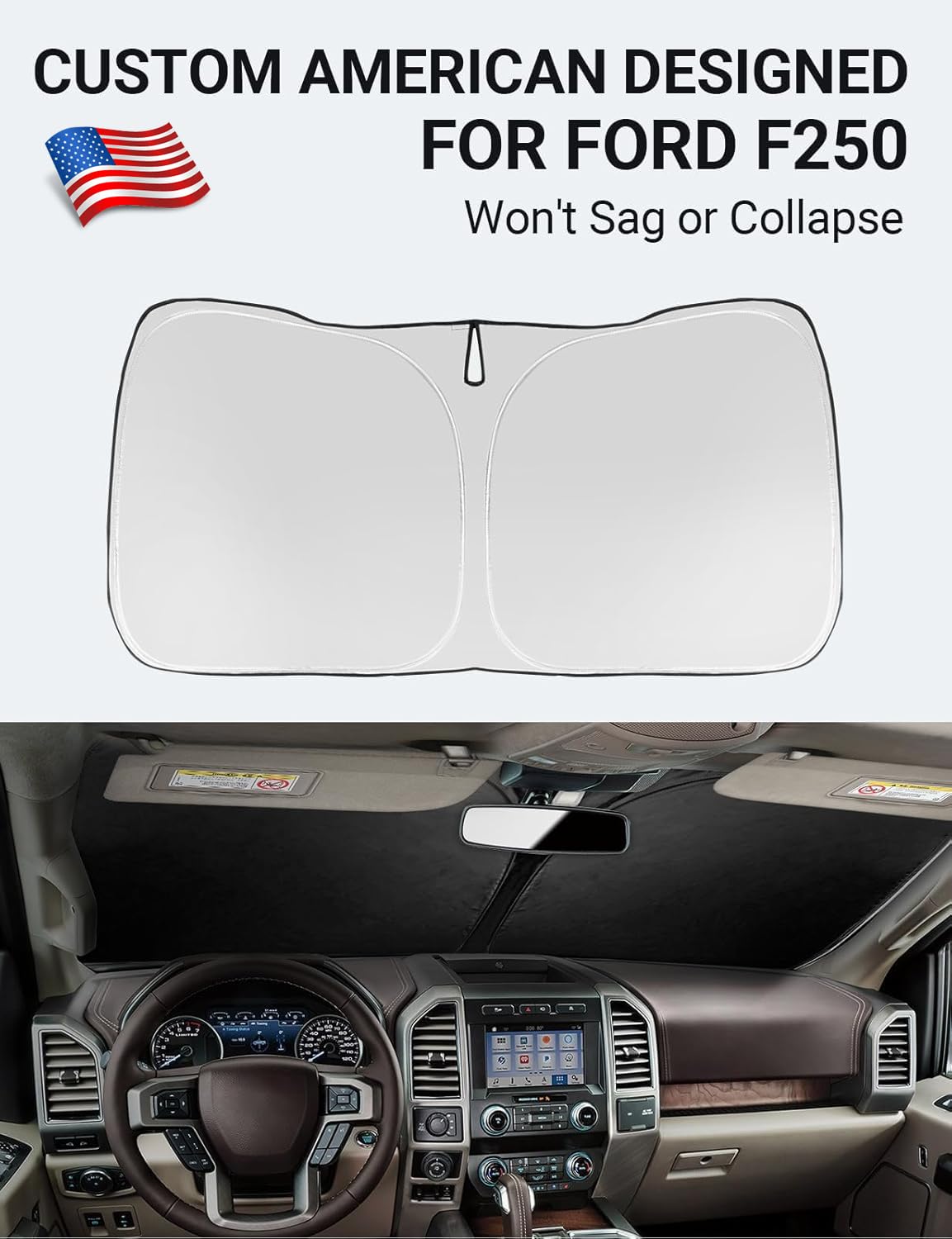 CUSTOM DESIGN: The windshield shade has been custom cut specifically for Ford F150. Precise fit design and Reinforced steel rings make enough to make the shade fit precisely to the window, no need to use suction cups to hold it in place. It won't sag or collapse like other sunshades. Fits all Ford F250 2025 2024 2023 2022 2021 2020 2019 2018 2017.