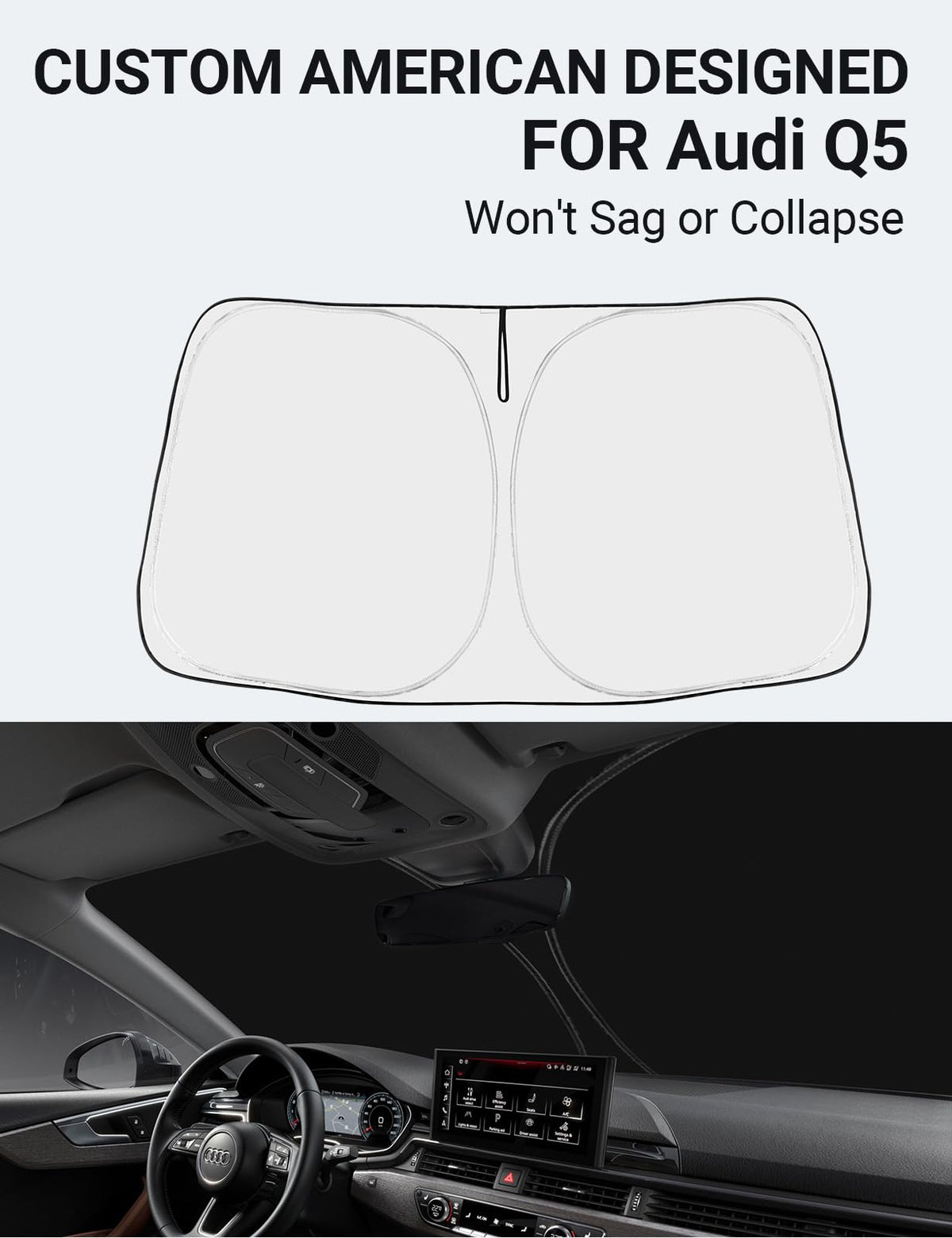 Designed in USA!!! CUSTOM DESIGN: The front windshield shade has been custom cut specifically for Q5. Precise fit design and Reinforced steel rings make enough to make the shade fit precisely to the window, no need to use suction cups to hold it in place. It won't sag or collapse like other car heat shields. Fits for 2025 2024 2023 2022 2021 2020 2019 2018 Q5.