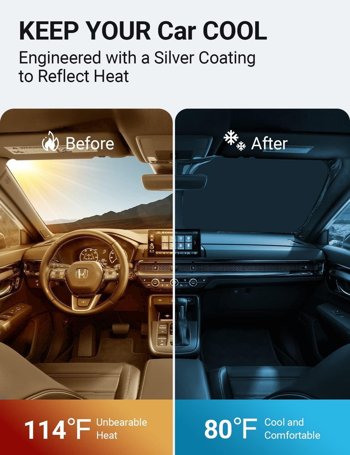 Designed in USA!!! CUSTOM DESIGN: The front windshield shade has been custom cut specifically for 2023 2024 Honda CRV. Precise fit design and Reinforced steel rings make enough to make the shade fit precisely to the window, no need to use suction cups to hold it in place. It won't sag or collapse like other car heat shields. Fits for Honda CRV CR-V 2023 2024 2025.