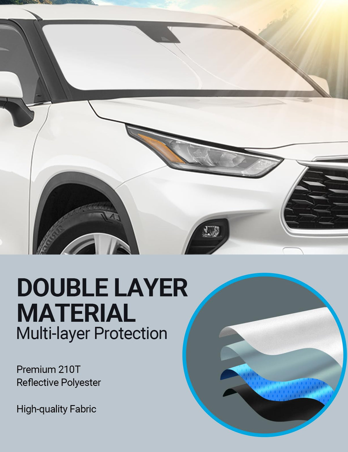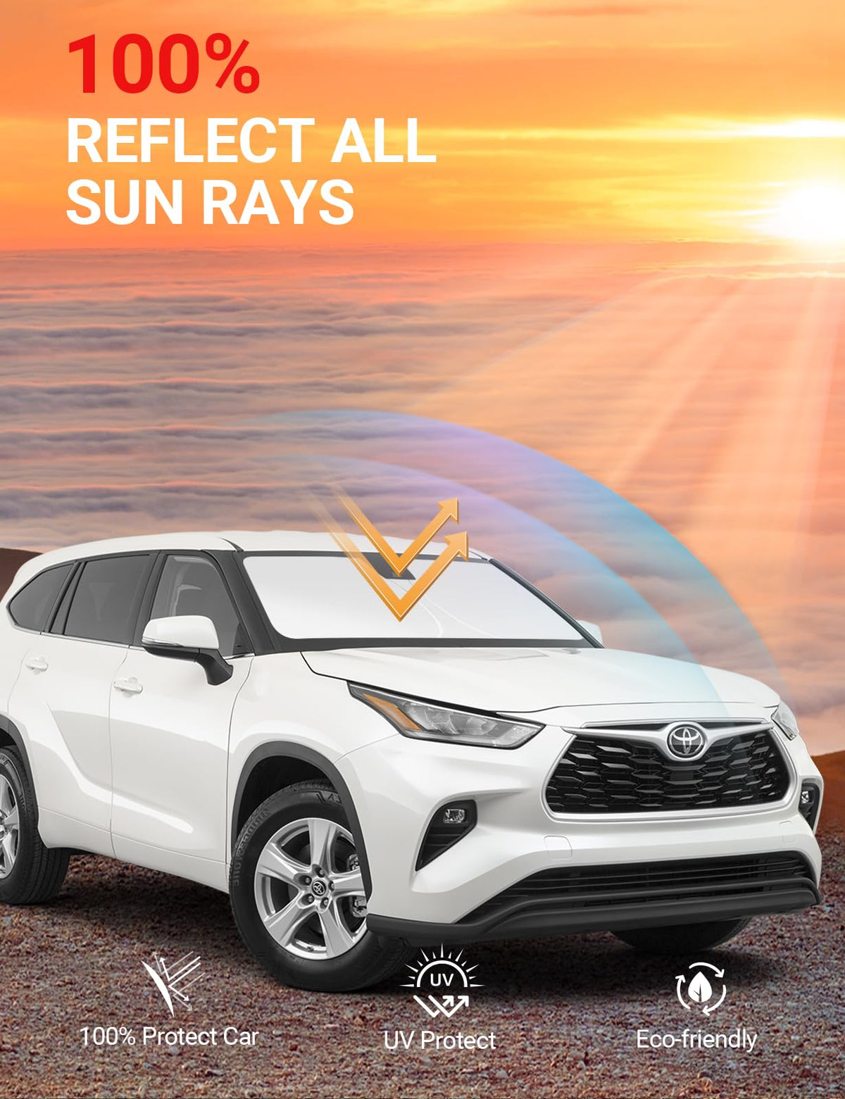 Q: How does the sunshade protect my car's interior?A: The Proadsy Front Windshield Sun Shade reflects heat and blocks 99% of harmful UV rays, helping to keep your Highlander cooler and preventing damage to leather seats from cracking and fading.