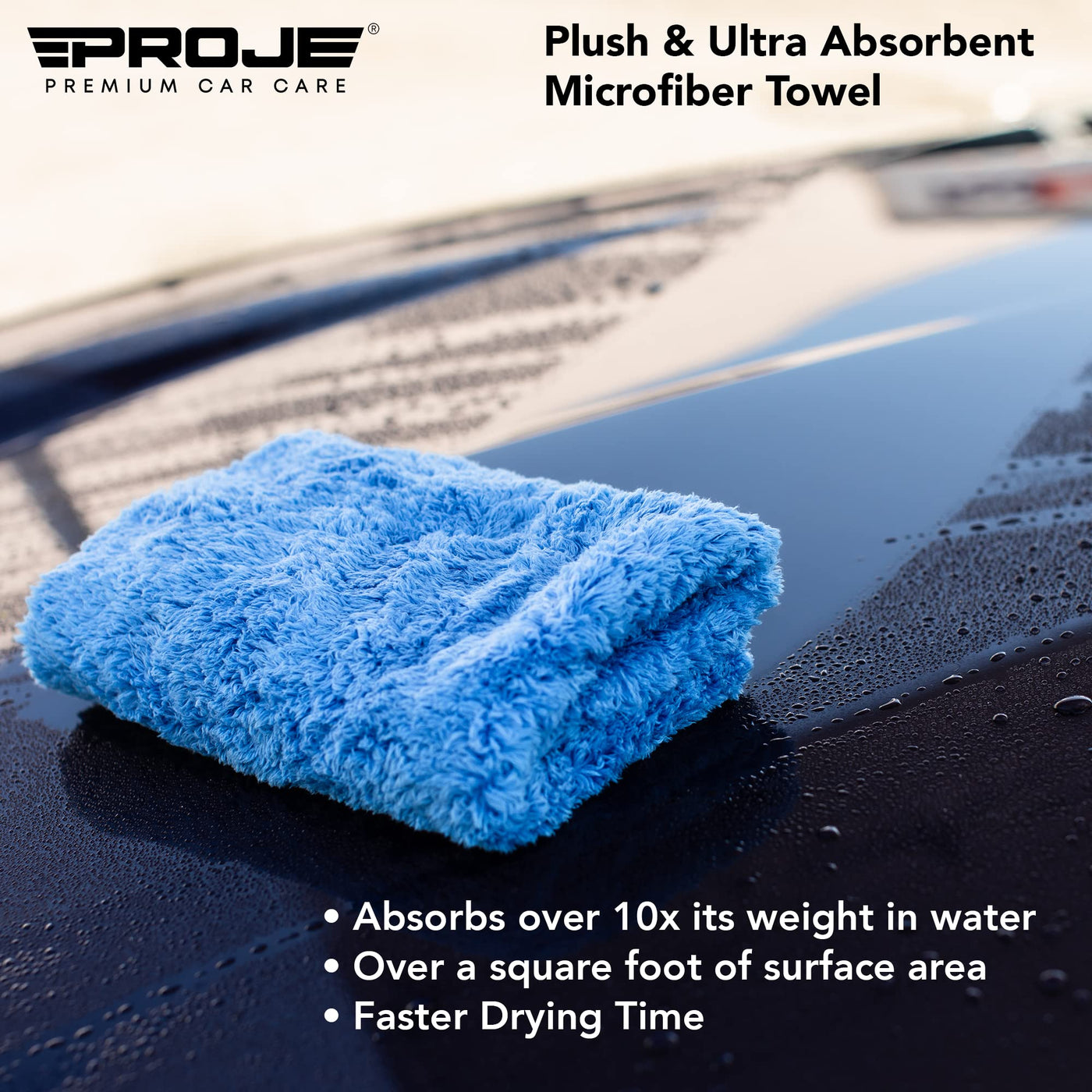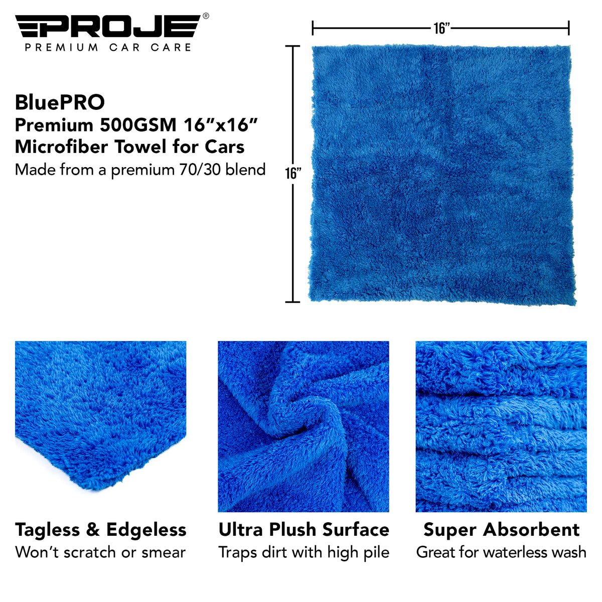 Proje Premium Car Cares professional grade plush Blue Microfiber Towels are edgeless, tagless, and rated at a premium 500 GSM (Grams Per Square Meter), making it one of the softest towels Proje offers. Ultra-Soft, Plush-Long Pile Non-Abrasive Microfiber Cloths will not scratch paints, coats, or other surfaces. Great for windows, glass, mirrors, chrome, screen, car, and all kinds of smooth surfaces. Extra plush, ultra-soft, super absorbent, thick, heavy-duty, durable, and scratch-free. Super plush and smooth, the long piles of microfiber quickly and easily remove the residues of detailing sprays, waxes, compounds, and sealants. Use it dry like a super dust magnet to clean your house, car, and boat, or absorb water like a chamois towel. Damp the microfiber towel with water to shine mirror, glass, bowling balls, or polish chrome without any polishing chemical. Magically lifts dust, dirt, and grease away from your cleaning surface without leaving streak marks. The towel can be folded into a comfortable pad for efficient use. Great for cleaning musical instruments such as guitar, violin, piano, oboe, flute, and more. Clean your prescription or sunglass lenses, computer screens, cell phones, and LCD screens. Durable up to 500 wash cycles. Recommend washing separately on delicate and tumble dry low or air dry. Multiple colors available.