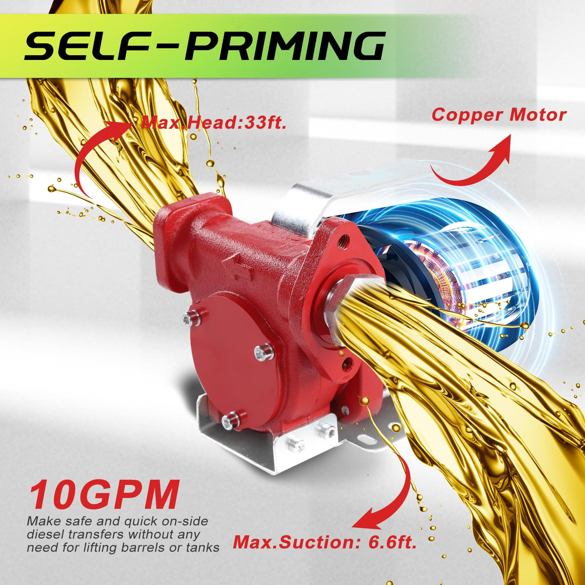 PRUNkuar 12V Fuel Transfer Pump w/Manual Nozzle & Hose, 10 GPM High Flow DC Diesel Transfer Pump, Heavy Duty Fuel Oil Transfer P