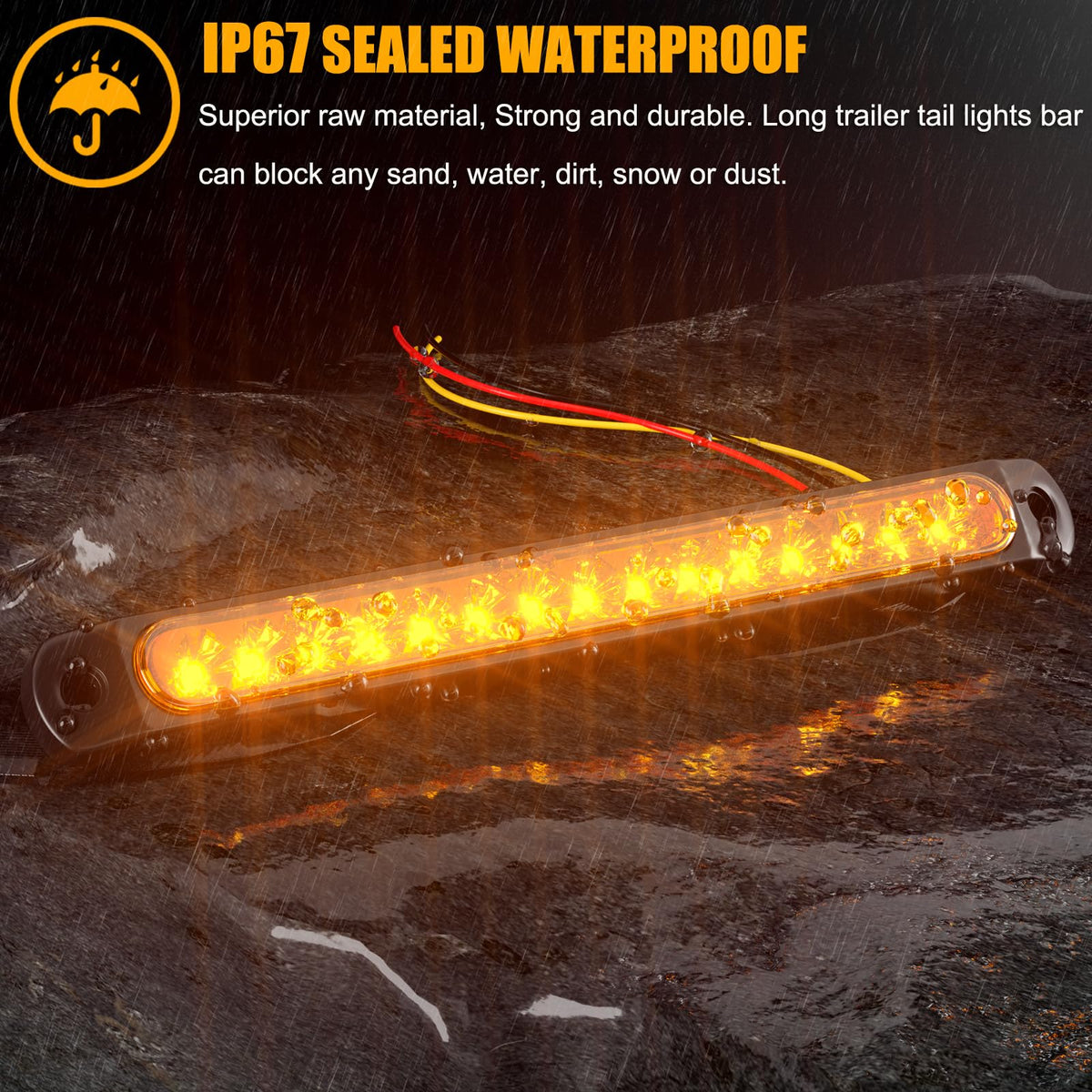 Functions: Functions as Marker Light, Side Marker Light, Turn Light, Turn Signal Light, Turn Flow Light, Sequential Turn Signal Light, Running Light, Tail Light, Clearance Marker or Identification light, etc | Utility&Brightness: Newly upgraded taillight has two amber lighting functions: Marker Running Light is constant light with 60% low brightness. Sequential Turn Signal Light is turning signals with 100% high brightness, which can alert the rear vehicles and people to avoid and ensure safety | Easier to Install after Upgrading: Surface mount. Left and right outward lead wire notch design can avoid opening wire holes. Glue seals the wire outlet to prevent short circuit. 3-wire connection: Black is Negative; Red is Marker Running Lights; Amber is Sequential Turn Signal Lights | Features: Ultra-slim Line LED Strip Signal Lamp with Smoked Lens, Super Brightness 15 Diodes LED Combination with Better Heat Distribution, Material: ABS Housing & Sealed Polycarbonate Lens, Dust-proof, IP67 Waterproof | Applications: For use on Heavy Duty Trucks (Peterbilt Freightliner Kenworth Mack Western Star), Semi Trailers, Cargo Trailers, Boat Trailers, work Vehicles and a Wide or Narrow Overland Vehicle Requiring Quality DOT Rated Lighting, Van, Bus, Pickup | Package: Included 2 x LED Tail Lights, 4x Screws, 4x Screws Caps
