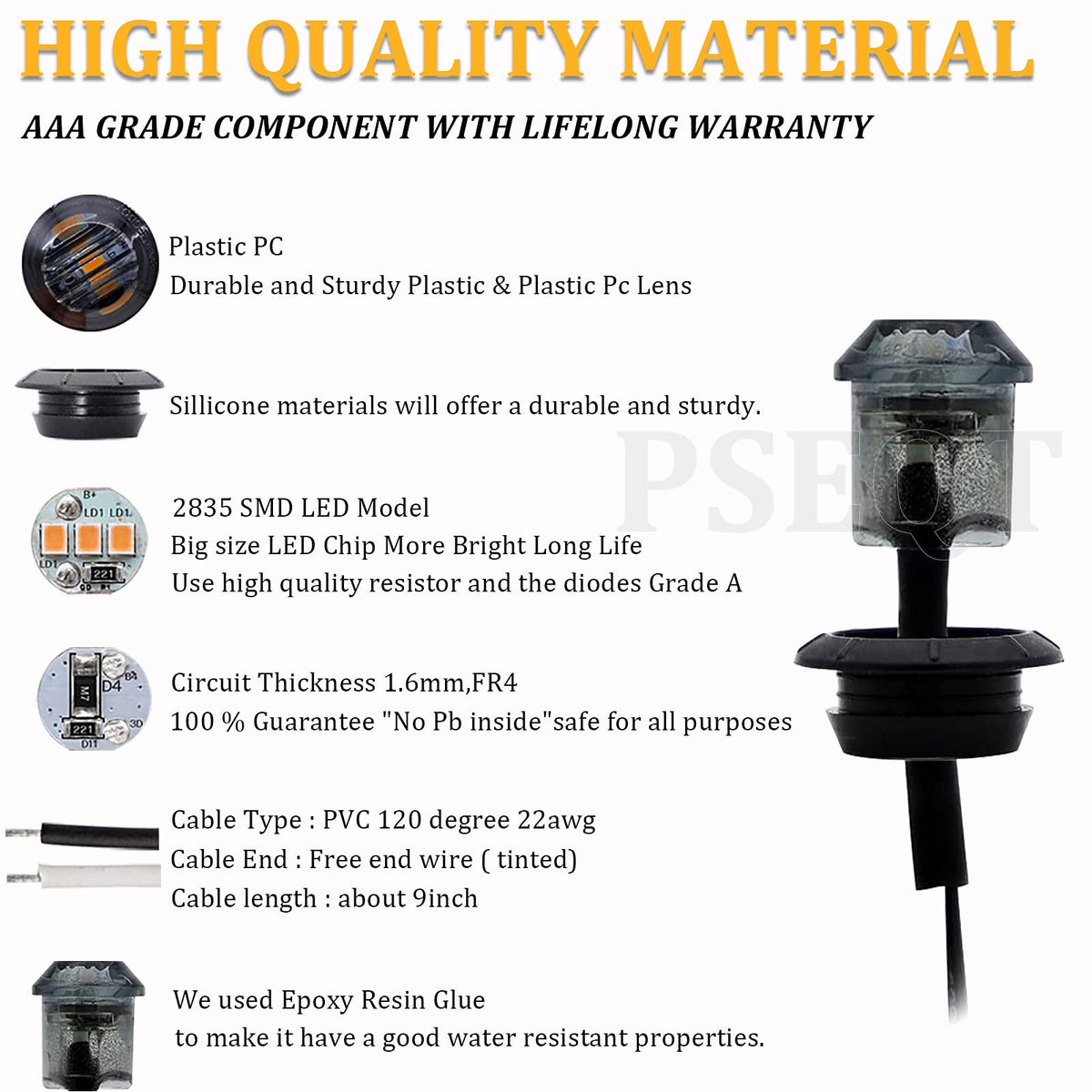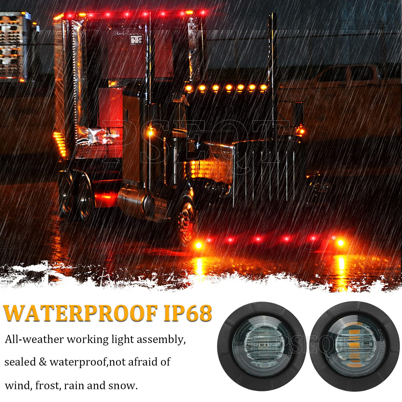 Q: Are the PSEQT Side Marker Lights waterproof?A: Yes, the PSEQT Side Marker Lights are rated IP68, which means they are completely sealed and waterproof. They can operate effectively in wet conditions, making them suitable for outdoor use in various weather environments.