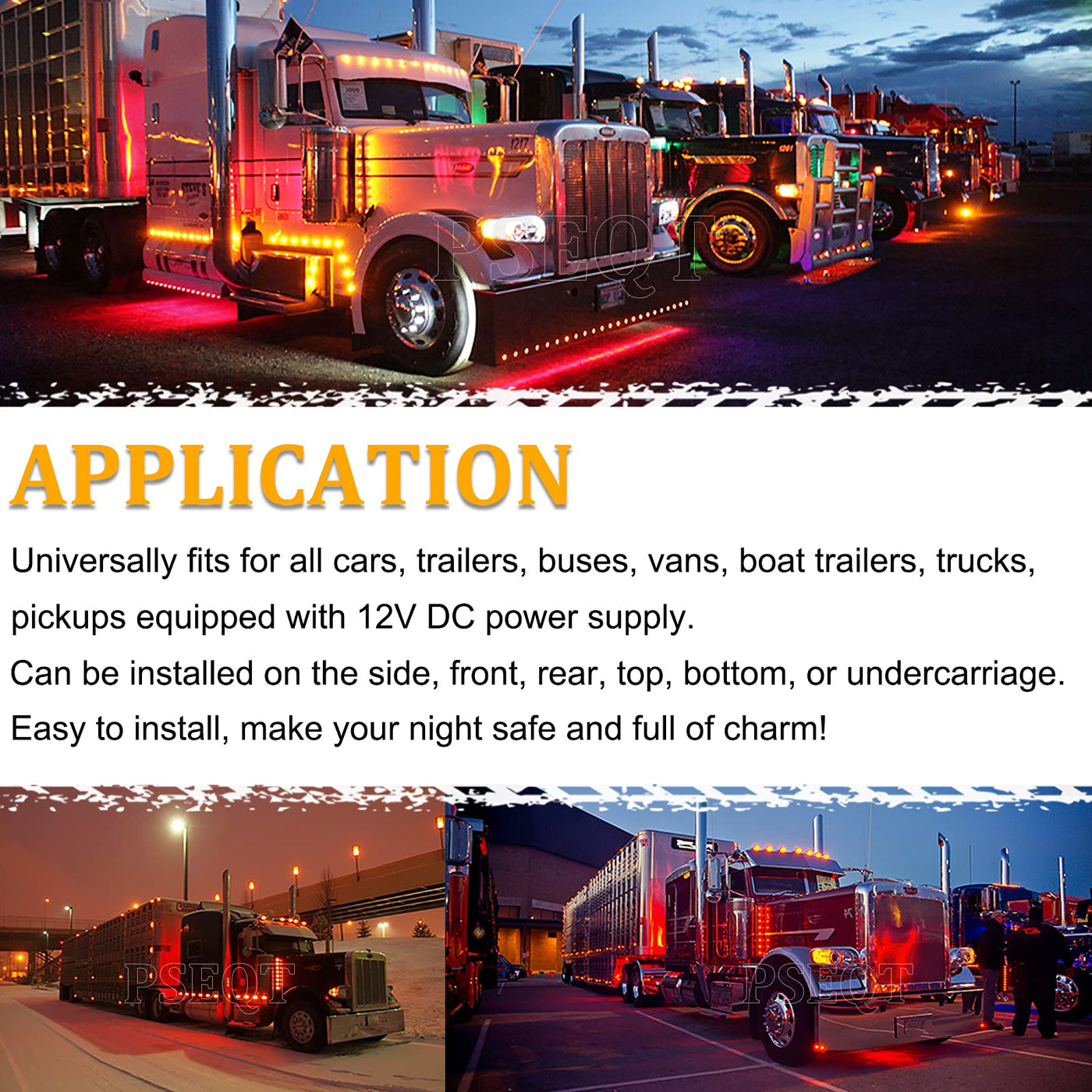 Q: What vehicles are compatible with the PSEQT LED Side Marker Lights?A: The PSEQT LED Side Marker Lights are universally compatible with a wide range of vehicles, including trailers, trucks, vans, buses, SUVs, RVs, ATVs, UTVs, and more. They can be installed on any vehicle that operates on a 12V DC system.
