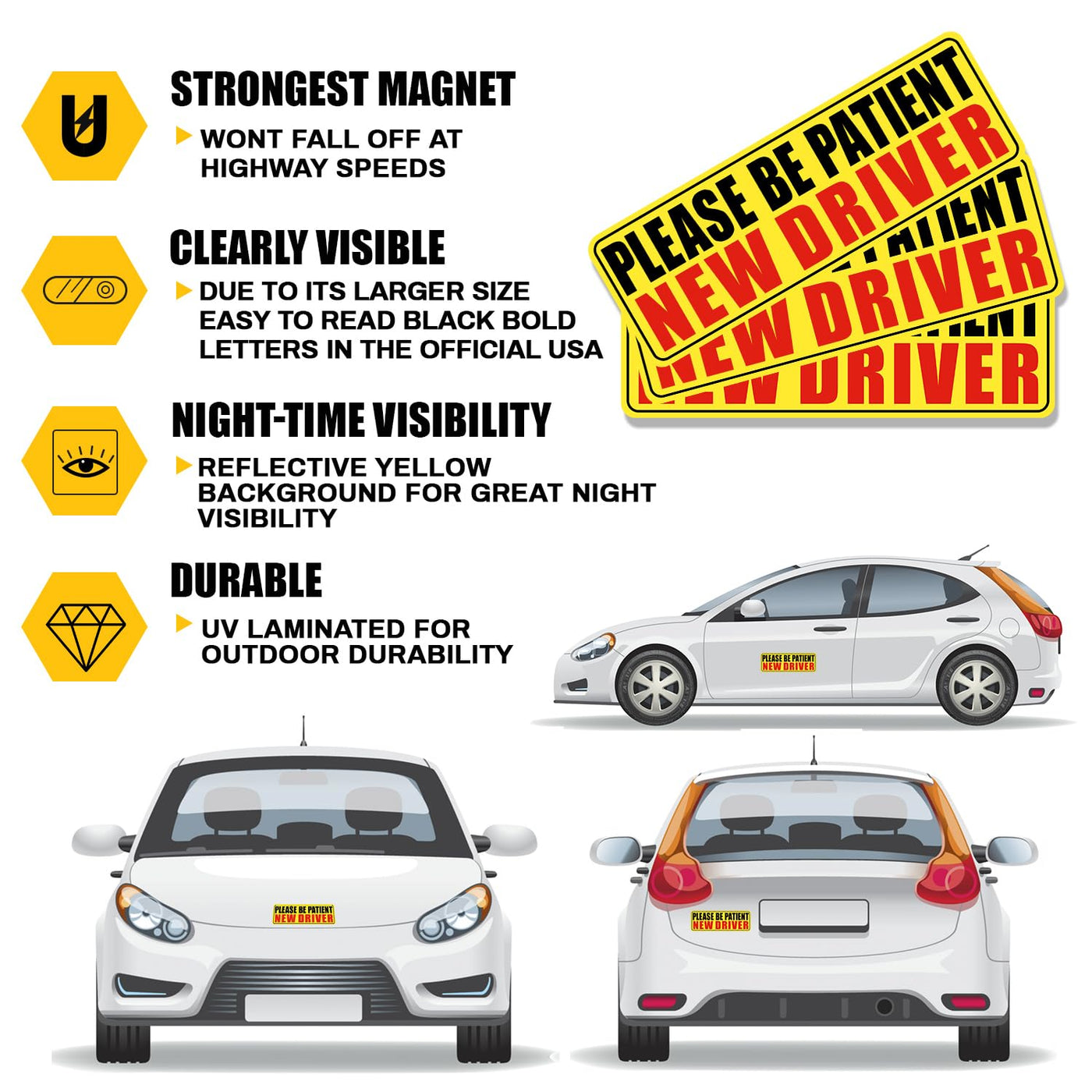 Strongets Magnets: The student driver car magnet is made of thick strong magnet. Compared with other magnets, it is thicker, stronger, more durable and be patient student driver magnet can be more firmly attached to the surface of the car, we have tested for a long time at high speed, heavy rain and snow and never fall off. Tip: Magnets can only be attached to metal surfaces, not to plastic or aluminum parts | Unique design: New driver sticker signs will be displayed humorously and can make others aware that you are learning to drive, then they will be tolerant of providing you with more space and respect and reduce the possibility of annoying honking while controlling the speed of their car to prevent an accident. Student driver magnet also can reduce the level of nervousness teen driver feel when driving | High Reflectivity: New driver magnet for car is made of high quality waterproof and heat resistant materials through strong magnetic and highly reflective materials to maximize the amount of light reflected from the sign, attracting people's attention and ensuring that the rookie driver car magnet is clearly visible even at night, in fog and rain, and other drivers can notice you from the side and back of the car. An excellent tool for teens with no driving experience | Removable and Reusable: Student driver signs for car removable, easily removable or transferable thanks to the magnetized backing. All driver magnets can be removed and reattached anytime. You can easily transfer it to another car when it is needed. Perfect as a gift for your family, colleagues, friends during various holidays, parties, birthdays | Customer Support: We are dedicated to providing the best quality new driver sticker for car to our customers. If you have any concerns about our please be Patient student driver magnet, please feel free to contact us. We're here to assist you and will provide a prompt response