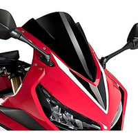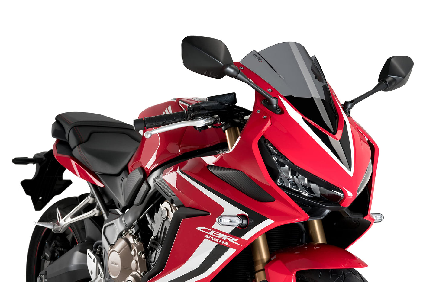 Racing Screen Puig. Give your bike the competitive character you've always looked for with the Puig Racing screen. Manufactured in 3mm high impact acrylic, resistant and long-lasting material rounded to> 2mm (complying with German TÜV regulations), thanks to its double height, the effect of air hitting on the helmet will be greatly reduced. This screen is available in two models: Z-Racing and R-Racer, depending on the model. The design of the Z-Racing screen has been tested in the wind tunnel, improving the aerodynamic coefficient and the protection against wind gusts by 12. 7% (upright position) with respect to the original model and by 61% in racing position. On the other hand, the R-Racer screens, apart from being studied in the wind tunnel, are developed together with racing teams from the SBK World Championship and Endurance, achieving a perfect balance between protection and aerodynamics. The assembly of the piece does not require modifications and is accompanied by an exhaustive aerodynamic study. The part contains ABE approval certificate 38182. Reference: 3568N; Colour: Black; Adapted to: Honda CBR650R 19'.