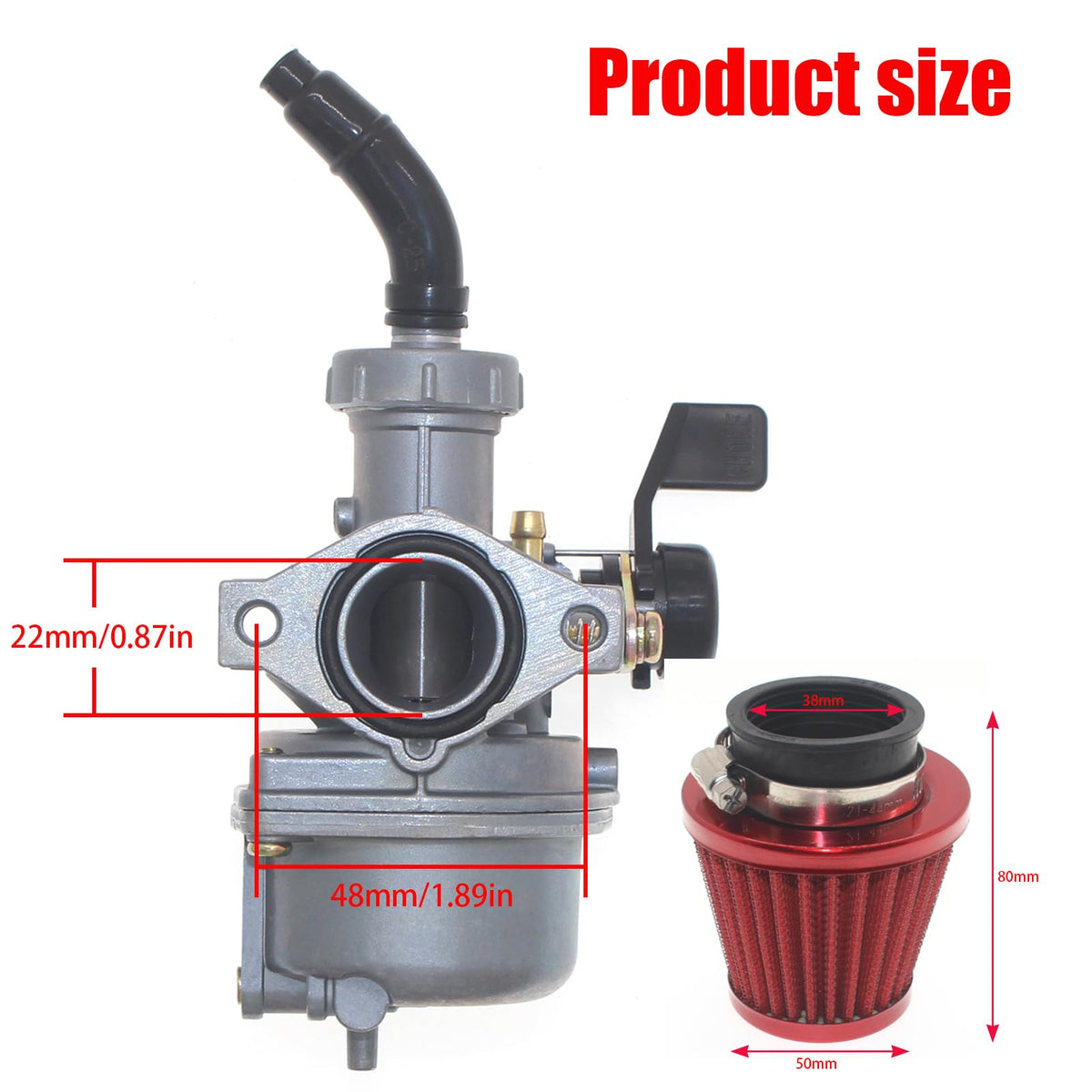 Q: What are the dimensions of the PZ22 Carburetor?A: The PZ22 Carburetor has an intake mount diameter of 22mm, a bolting hole distance of 48mm, and is compatible with air filters sized between 38mm and 40mm.