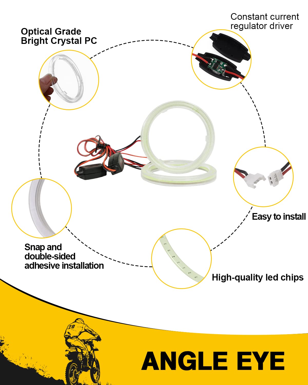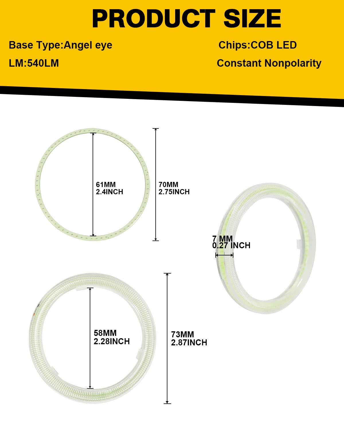 Voltage: 9-30V, Current: 300MA, LED Number: COB 45SMD, Lumen: 540LM, Color: Ice Blue | Wire length: 30cm, Material: Silica Gel《150°C | With constant current regulator, it can connect 12V-24V DC voltage, Does not fail due to voltage fluctuations. It is useful in prolonging the life of the product during operation. | Application: Daytime running light, high beam, turn light, headlight, width lamp, fog lamp, loudspeaker decorative light etc. | Please make sure the size of the rings matches your car's headlight area before purchase.