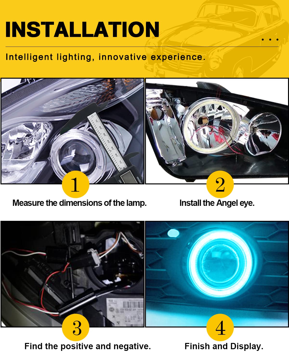 Q: How do I ensure proper fitment of the halo rings on my car's headlights?A: Before purchasing, please check that the size of the 70MM rings matches the headlight area of your vehicle to ensure a proper fit.