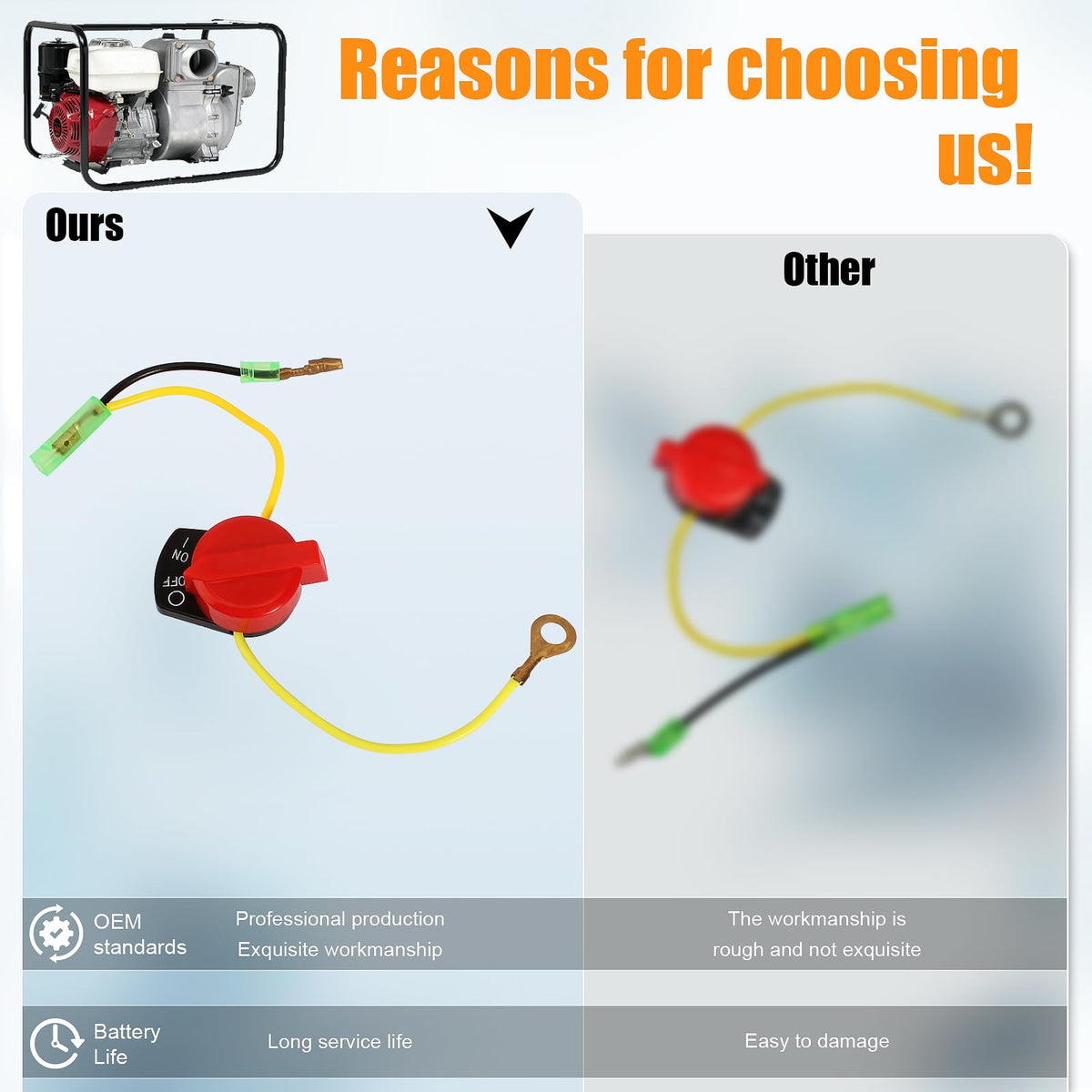 Q: What engines are compatible with the QAZAKY On/Off Engine Stop Kill Switch?A: The QAZAKY On/Off Engine Stop Kill Switch is compatible with a wide range of engines, including GX100, GX110, GX120, GX160, GX200, GX240, GX270, GX340, and GX390. It also works with generators such as ED1000, EZ1400, EG1400, EG1000, EZ2500, EZ3500, and EZ5000, as well as pumps like WT30XK4 and WT40XK3, and pressure washers like CC4033 26A-BPH3710.