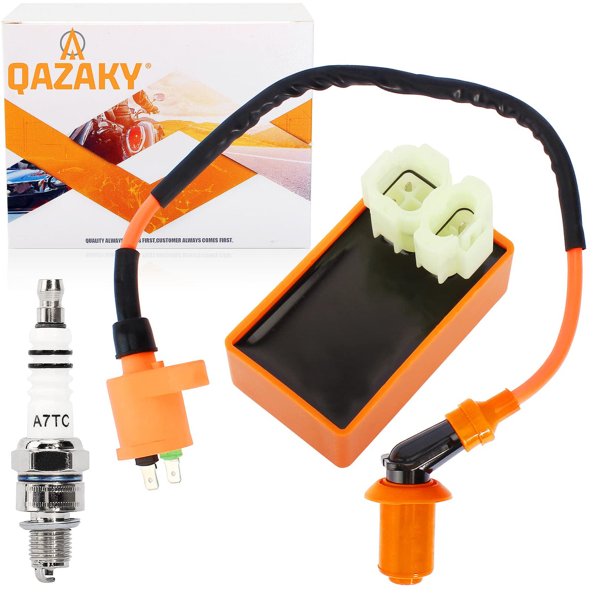 Q: What is included in the QAZAKY Performance AC CDI package?A: The package includes one ignition coil, one CDI box, and one spark plug. This comprehensive set ensures that you have all the necessary components for effective engine performance.