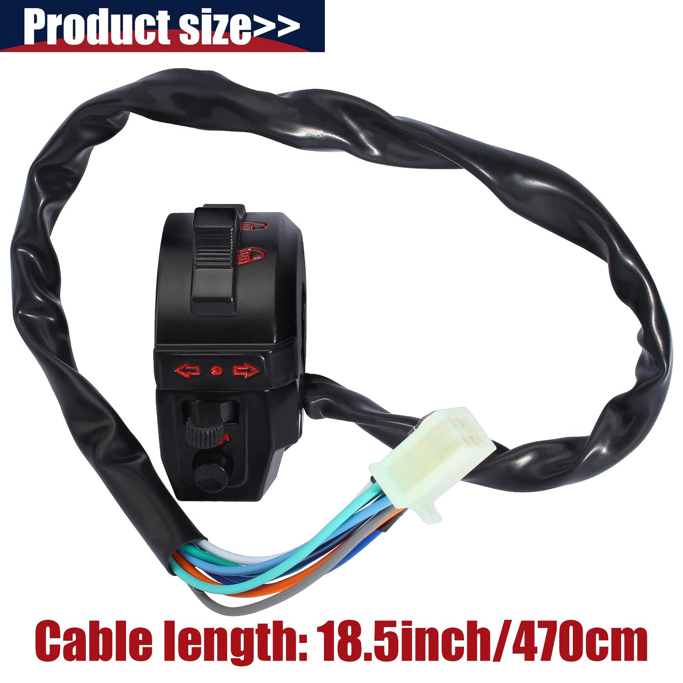 Specifications: Position: left. Voltage: DC 12V. Color: black anodized. Cable length: 18 1/2inch (47cm). Diameter of hole: 7/8inch (22mm). Switch thickness: 1 1/4inch (3.2cm). Material: PVC, ABS, heavy duty aluminum shell. Package include: 1 x motorcycle left side control switch. Compatible with: Fits universal switch for 7/8inch diameter handlebars. Fits most motorcycle, motorbike, ATV, quad, scooter, go kart, moped, chopper, pit bike, dirt bike, racing bike, mini bike and other bike. For Suzuki, Yamaha, Kawasaki, Ducati, Aprilia, Vespa, Kymco, Piaggio, Agusta, Banshee, Polaris with 7/8 inch handlebars. Features: Heavy duty aluminum housing for perfect durability, water and weather proof. Compact size, All-in-1 design switch control. Built in turn signal switch, horns switch and hi/lo beam switch. Easy access & comfortable control, will not interfere with clutch. Perfect for dual sport applications or any street motorcycle.