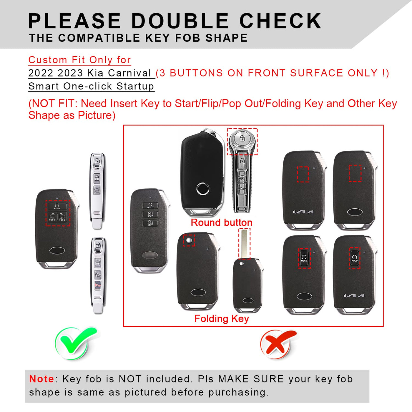 Q: Is this key fob cover compatible with all Kia models?A: No, the QBUC key fob cover is specifically designed for the 2022 and 2023 Kia Carnival with 3 buttons on the front surface only. Please check the compatibility of your key fob against the third picture before purchasing.