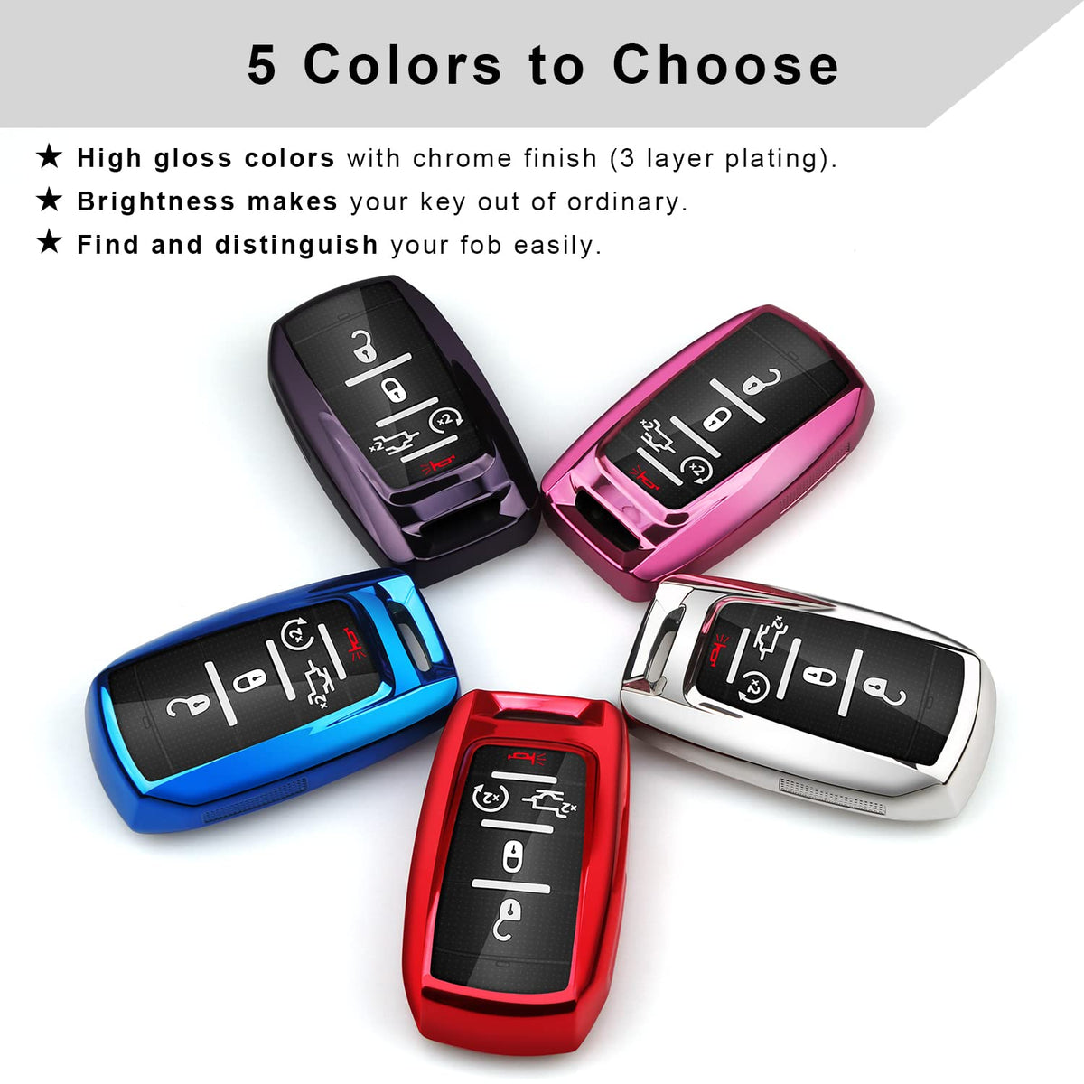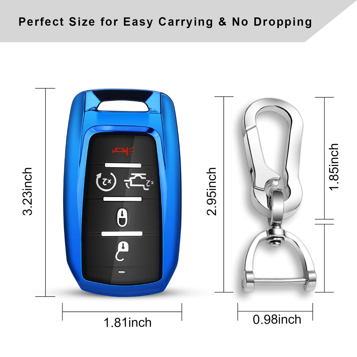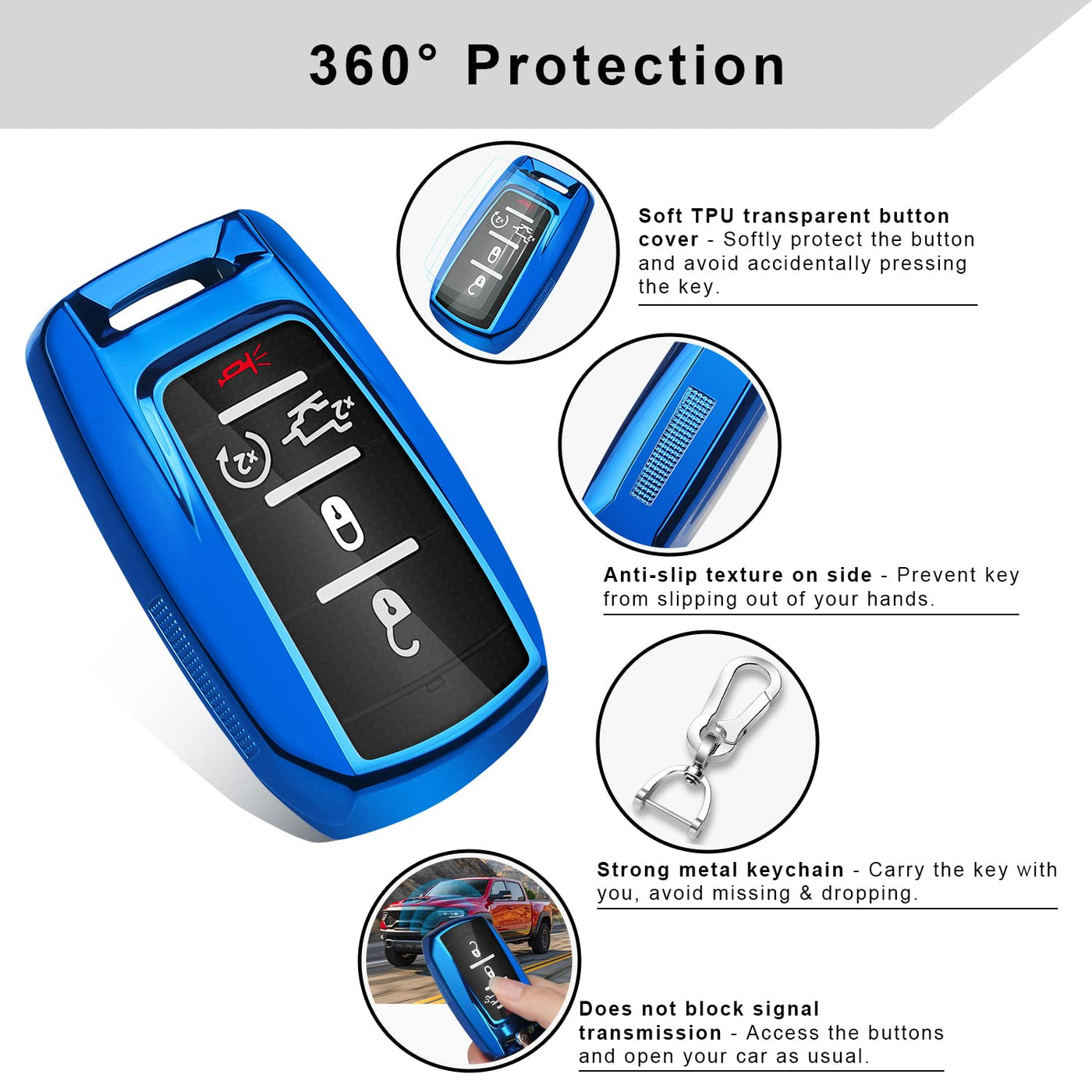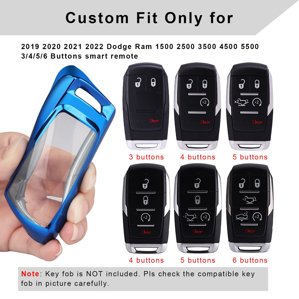 ?Custom Fit for Ram Key Fob Accessory?The for Ram key cover is designed for 2019 2020 2021 2022 Dodge Ram 1500 2500 3500 4500 5500 3/4/5/6 Buttons smart remote. Fits perfectly like a glove. Pls note key fob is NOT included. | ?Durable Materials?The for Ram key fob case is made of premium soft TPU, which is healthy, smooth, comfortable and in lightweight, does not add much bulk or size to the fob. The chrome finish with strong color fastness (3 layer plating) will keep your key look new and cool. | ?Personalized Design?The compatible with Ram keychain is designed in 5 different fashion high gloss colors. The brightness makes your key out of the ordinary. Enable you to find and distinguish your fob easily. Pls note our case won't cover the panic button comparing with others'. | ?360° Protection?The for Ram key protector will offer all-around effective protection to your key from shock, collision, scratches and other damages without affecting the signal transmission. And the button cover will prevent you from accidentally opening the key. | ?Easy Installation?The compatible with Ram key holder is easy to install and fix with the keychain. The package include 1*case, 1*keychain, 1*screwdriver. It is a wise investment for your expensive key remote.