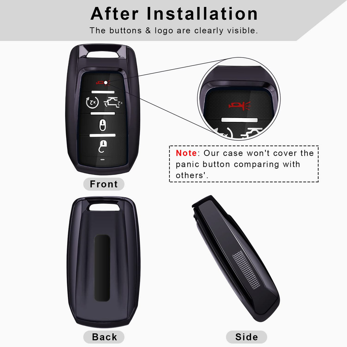 【Custom Fit for Ram Key Fob Accessory】The for Ram key cover is designed for 2019 2020 2021 2022 Dodge Ram 1500 2500 3500 4500 5500 3/4/5/6 Buttons smart remote. Fits perfectly like a glove. Pls note key fob is NOT included. | 【Durable Materials】The for Ram key fob case is made of premium soft TPU, which is healthy, smooth, comfortable and in lightweight, does not add much bulk or size to the fob. The chrome finish with strong color fastness (3 layer plating) will keep your key look new and cool. | 【Personalized Design】The compatible with Ram keychain is designed in 5 different fashion high gloss colors. The brightness makes your key out of the ordinary. Enable you to find and distinguish your fob easily. Pls note our case won't cover the panic button comparing with others'. | 【360° Protection】The for Ram key protector will offer all-around effective protection to your key from shock, collision, scratches and other damages without affecting the signal transmission. And the button cover will prevent you from accidentally opening the key. | 【Easy Installation】The compatible with Ram key holder is easy to install and fix with the keychain. The package include 1*case, 1*keychain, 1*screwdriver. It is a wise investment for your expensive key remote.