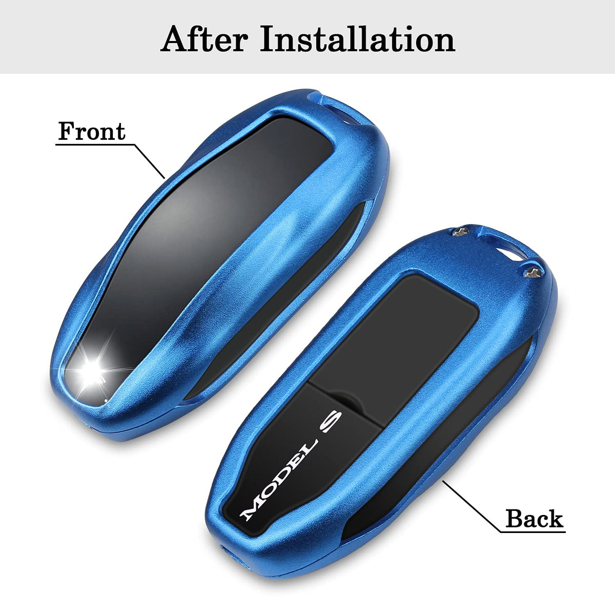 【Custom Fit for Tesla Key Fob Accessory】The compatible with Tesla keyfob holder is designed for Tesla Model S, Model 3 and Model Y smart remote base on original data. Fits perfectly and provides great protection to your Tesla remote. | 【Durable Materials】The for Tesla smart remote protective cover is made of high quality aluminum metal, which is rustproof, sturdy but in lightweight (shell thickness is around 1mm). It not only makes your key look deluxe, but also provides stronger protection than other materials. | 【Personalized Design】The scientific hollow design of the for Tesla keychain case, allows you to access the buttons easily. The strong keychain is for easy carrying and to avoid dropping. And you will find your key easily because of the bright color cover. | 【360-degree Protection】The compatible with Tesla Model S/3/Y key fob case will offer all-around strong effective protection to your key from shock, collision, scratches and other damages. It is a necessity for your expensive key remote. | 【Easy Installation】The for Tesla Model Y/S/3 key protector is easy to install with screws. The package include one case, keychain, screws, screwdriver, and sticky paddings (stick to the inside of the metal to gently separated the key from the metal, avoid from scratching.)