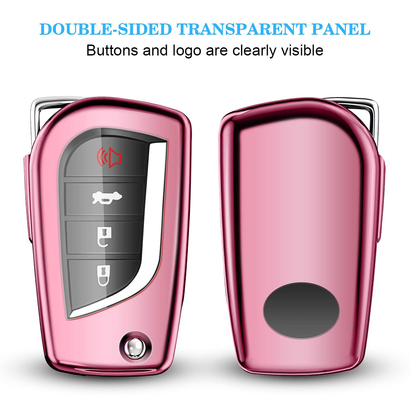 [Fits Model] This Key Fob Cover is fit for Toyota Fortuner tundra Camry RAV4 Highlander Corolla Tacoma Levin 4runner fold smart key, 3 and 4 buttons key. It will not cover the original car logo on your car key. | [Pay Attention] Because even if the type of the car is the same, the car key might be different based on the different year of manufacturing.So please before you purchase, pls DOUBLE CHECK your key fob shape by referring to the second image. | [No Signal Reducyion] Protect your key fob all around,but not affects your remote connection between your car and the key.Make your car key fob stay nice and safe.Really wise investment for protecting your expensive key fob. Come with a free Key Chain. | [High Quality ] Made with premium TPU material. Super thin, soft and trending looking and pretty durable. It has strong color fastness with triple electroplating, pretty durable. Make your key fob look new and premium. | [360