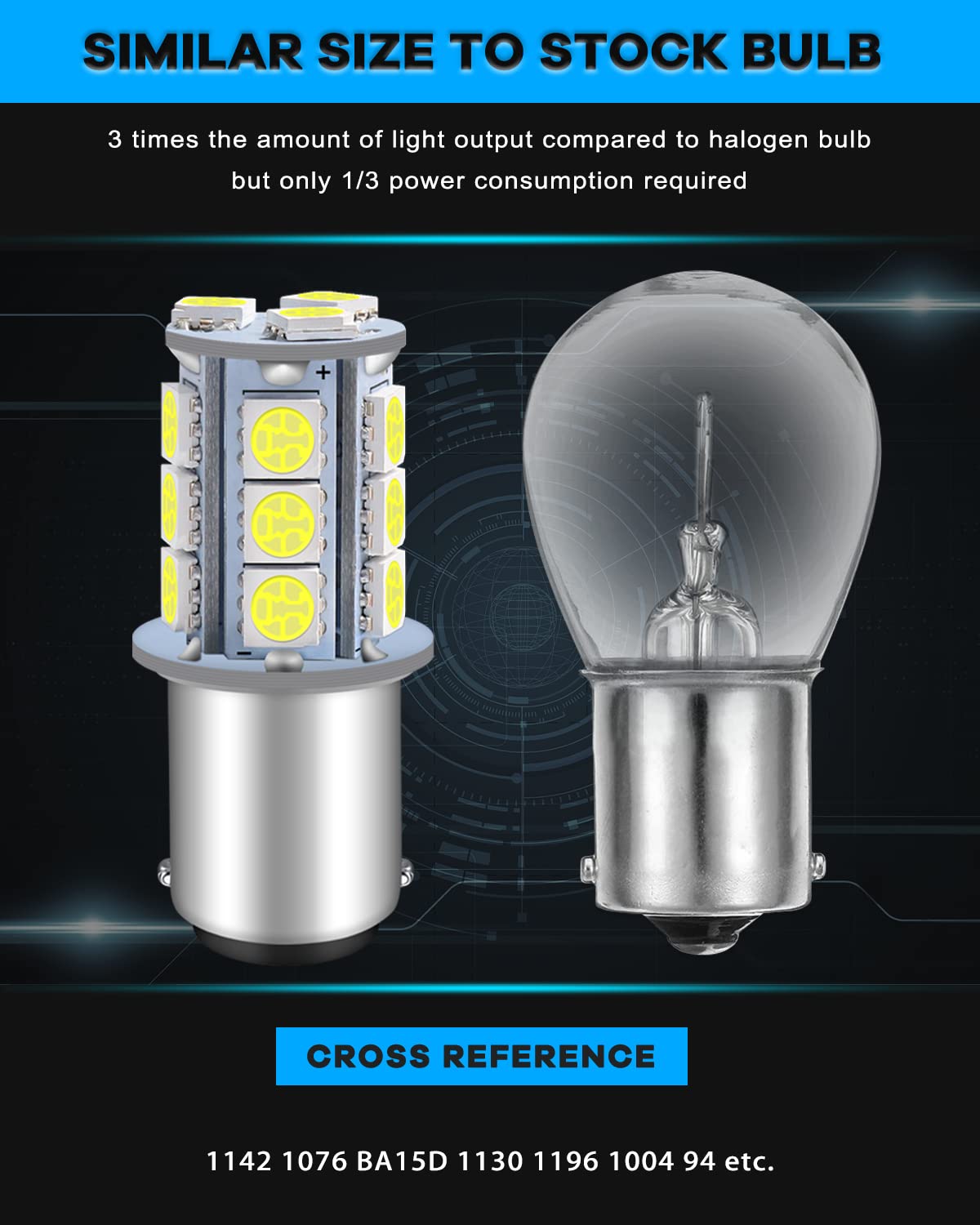 ?Outstanding Parameters?1142 led bulbs adopt 18pcs 5050 chips, 2W/bulb, providing 230 luminous flux. 6000K white color provides you a super bright beam of light, so that you are in a space full of bright. 360° beam angle, no dark spot. Suitable for RV lights from 12V-13V DC. | ?Cross Reference?These 12v led bulbs to replace 1142 BA15D 1076 base socket incandescent Bulb or #90 #68 filament bulbs light fixture (DO NOT WORK WITH 1176 SCOKET) | ?Applications?These rv light bulbs are used in many scenarios: RV vanity led light bulbs/ boat engine compartment light /RV Camper interior light bulb / Motorhome living room sconce light/ Sailboat interior Light /Ceiling bulbs /5th Wheel interior lights/ turn signal light/ backup reverse light/ brake light etc. | ?Low Power consumption?These 1076 led bulb for rv are energy-saving. Now that it's camping season, these bulbs are perfect for replacing the incandescent lights in your original camper/ RV. From brightness to lifespan, this is undoubtedly the best choice. | ?Sturdy Construction?These 1076 led bulbs have good contact, making the bulb work more stable. Many cheaper versions rotate on the base during installation and then break, our bulbs do not. ( Note: If it does not work, please rotate it 180° to use)
