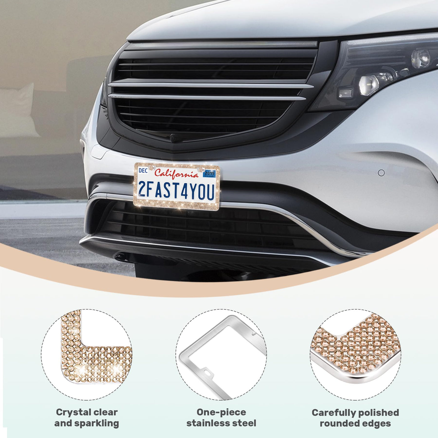 Q: Is the QUANQIUFEI license plate frame durable and weather-resistant?A: Yes, the frame is made from premium stainless steel and features polygon-cut crystal rhinestones, ensuring it is wear-resistant, waterproof, and able to withstand high temperatures and various weather conditions.
