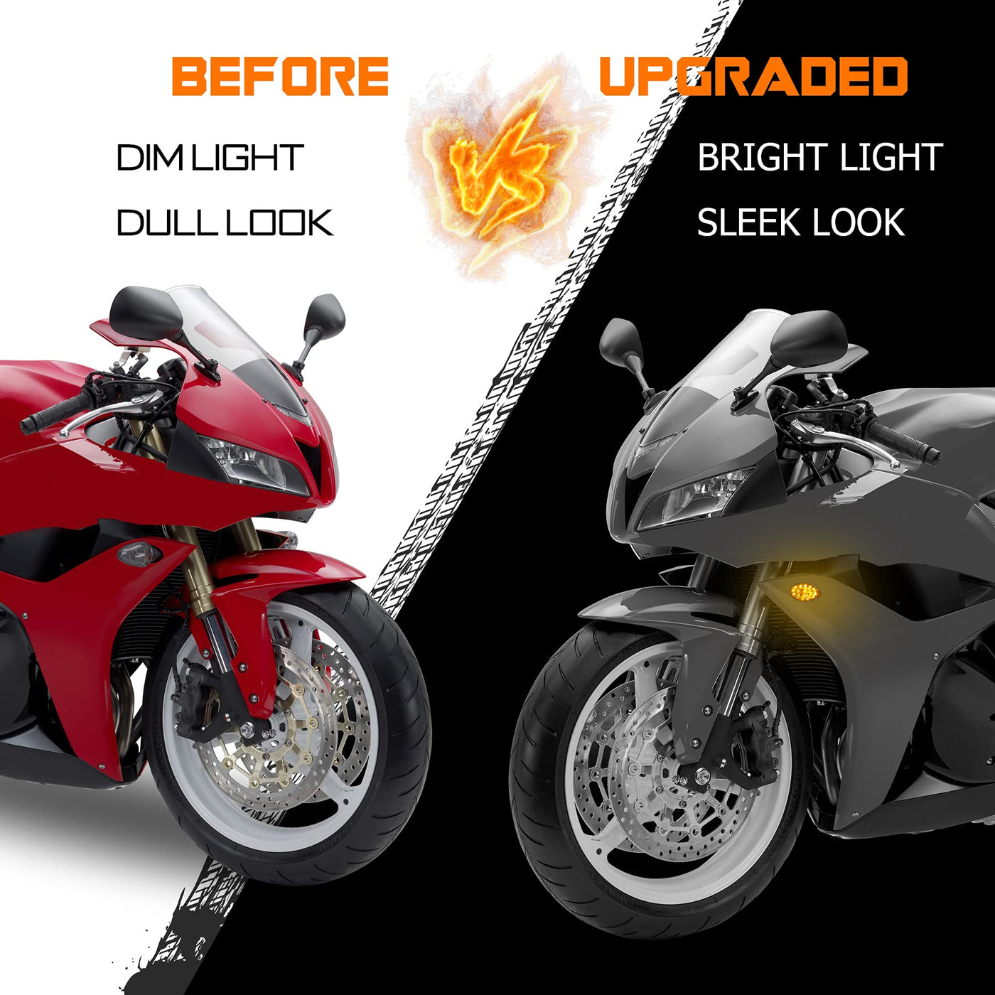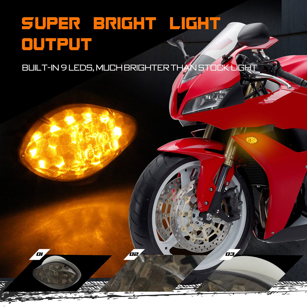 Package Including:2 x Flush Mount Front Led Motorcycle Turn Signal LightNotification1. If the lights stay solid, don't blink, you may need replace your factory flasher relays with led relay2. If the lights get hyper flash, recommend using a resistor to solve the issuesFitment:Compatible with 2004-2007 Honda CBR1000RRCompatible with 1999-2000 Honda CBR600F F4Compatible with 2001-2006 Honda CBR600F F4ICompatible with 2003-2012 Honda CBR600RRCompatible with 2000-2001 Honda CBR929RRAlso fit for most DC 12V motorcycles equipped with 10mm mount bolts turn signalSpecification:Lens Color: smokedLight color: amberLED Number: 15pcsLight Source: LEDVoltage: DC 12VFeatures:Flush Mount Easy Installation, no modification neededIP67 Waterproof, sealed well, keep water out even in heavy rain