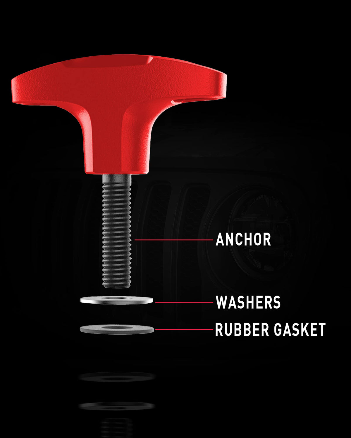 Q: What makes the Quick-Release Tie Down GP Anchor/T-Handle Bolts Set versatile?A: The Quick-Release Tie Down GP Anchor/T-Handle Bolts Set serves multiple functions, acting as a handle, grip, hook, or anchor for straps and add-ons. This 4-in-1 design allows for easy operation and quick Jeep top removal, enhancing usability for a variety of tasks.