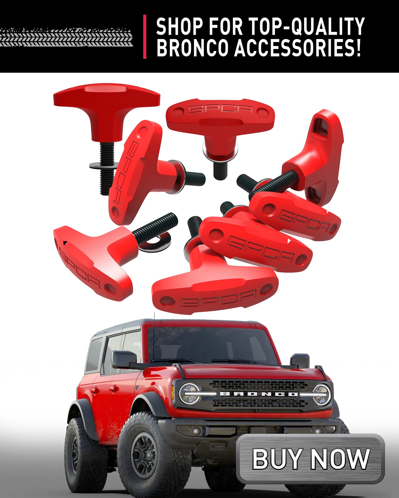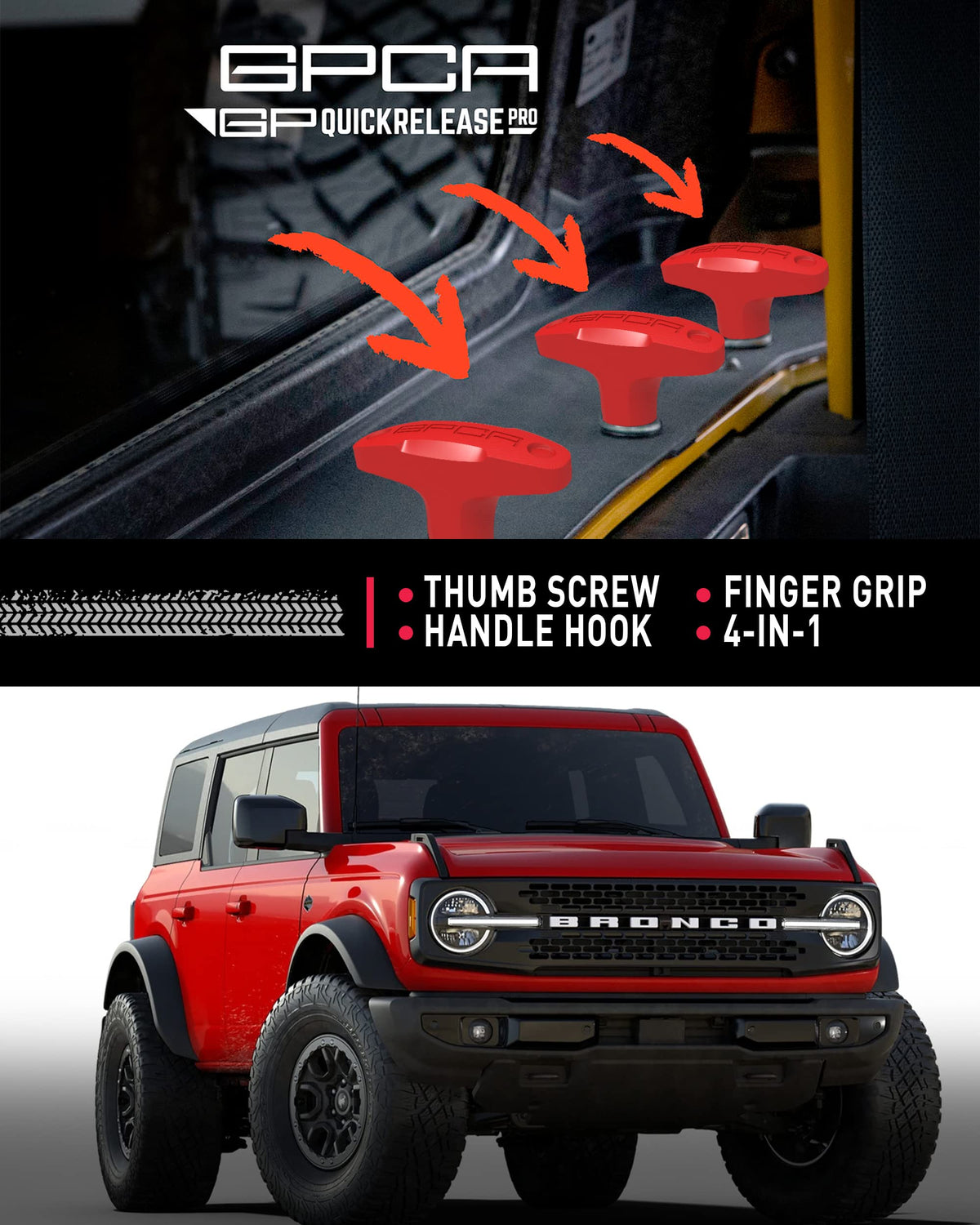 - SUPER VERSATILE - Use as a handle, grip, hook, or anchor for your straps and add-ons. Finger-Friendly quick releases thumb screw - Strong torque and more comfortable to hold onto - RUGGED LOOK EVEN FOR TOPLESS - Beautifully integrated and compatible with Bronco, with rubber-backed washers Dimensions: M8 - 1.25 screw, 60mm wide screw handle - COMPATIBLE with Bronco and Wrangler JL/ JK/ YJ, JT and Gladiator - Designed in the USA. Patented.