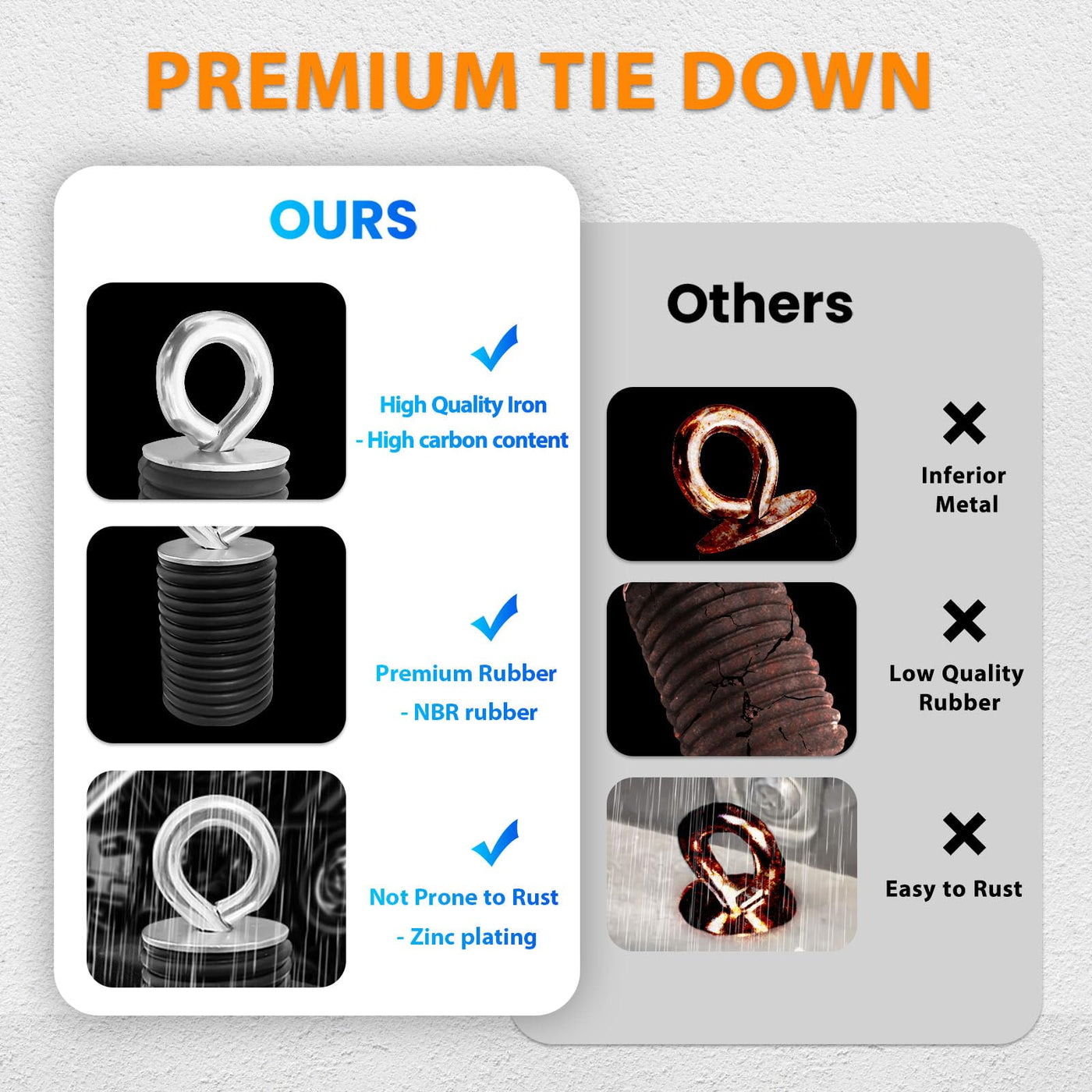 Q: What materials are used in the construction of these anchors?A: The Quickwolf Tie Down Anchors are made from high-quality galvanized iron and NBR rubber. This combination makes them corrosion-resistant and durable, ensuring long-lasting performance even with frequent use.