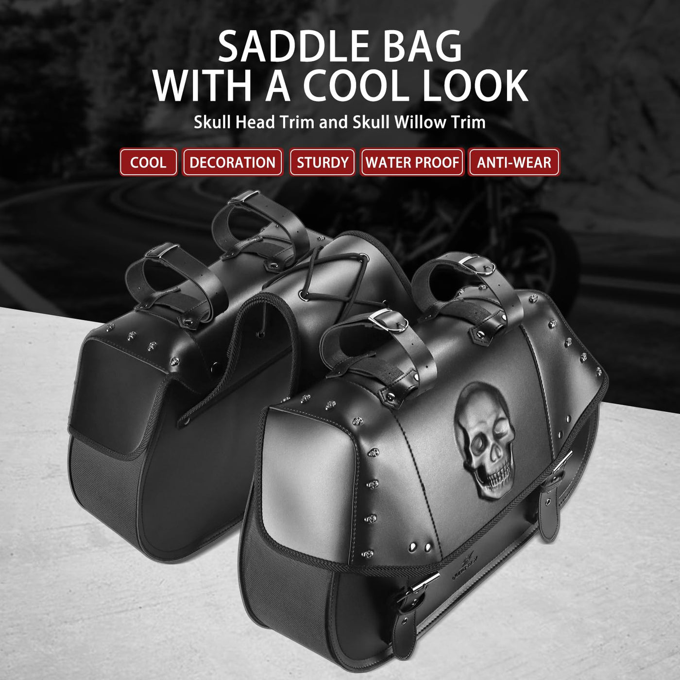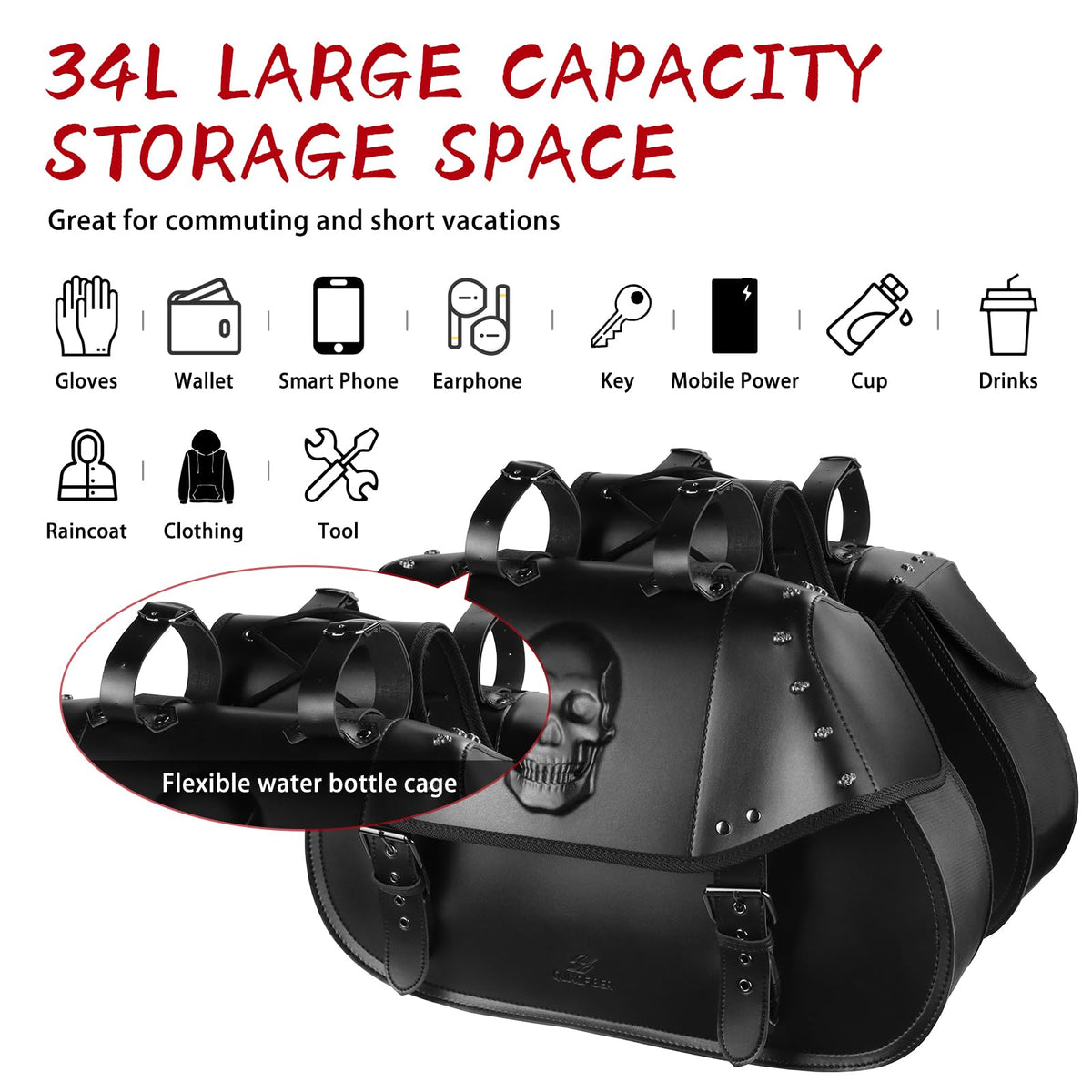 Quixofiber Motorcycle Saddlebags 34L Large Capacity Pu Leather Side Saddle Bags Waterproof Universal For Harley Honda Yamaha Kawasaki (3D Skull,Black)