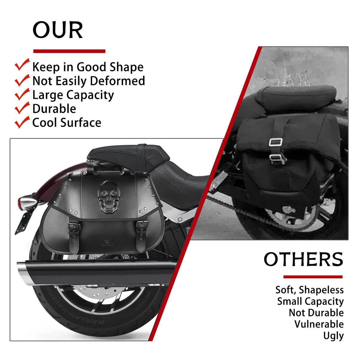 Q: How durable are the materials used in these saddlebags?A: These saddlebags are made from high-quality PU leather, which is resistant to the elements, ensuring your belongings remain safe even on long rides. Additionally, the reinforced structure and thick PE base provide added durability.