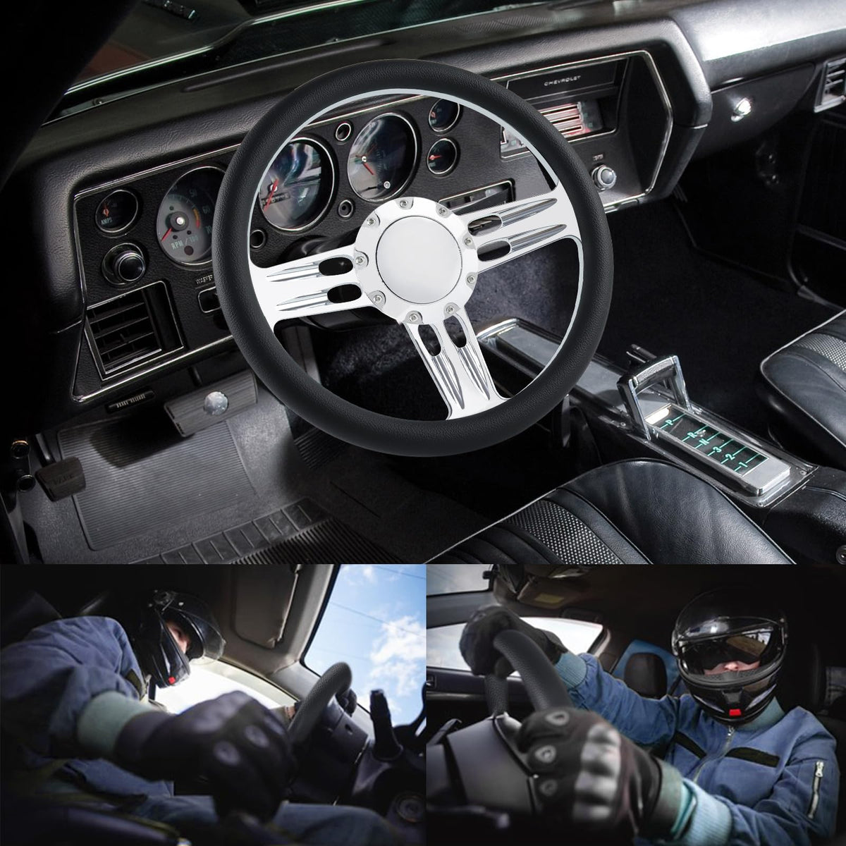 QYMOPAY 14 Black Leather 3 Spoke Steering Wheel - Fits Most 9 Hole Car Models, Durable Billet Design