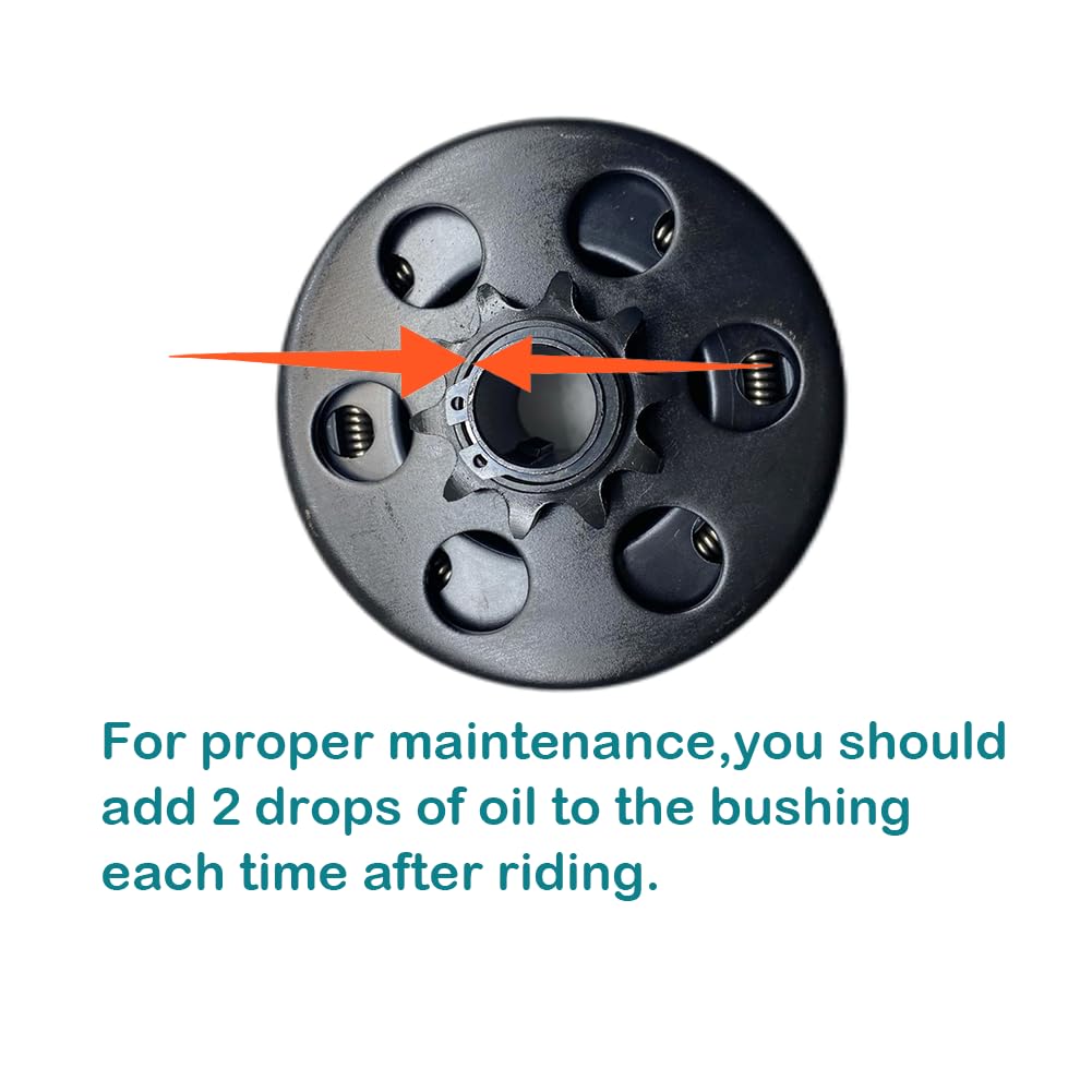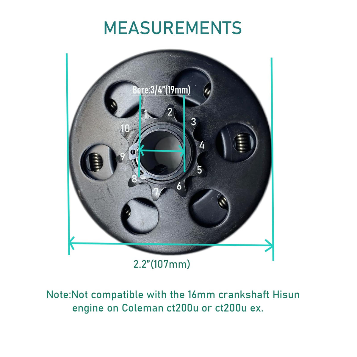 Q: Are there any important precautions to take when using this clutch?A: Yes, it is crucial to add oil to the clutch before its first use and to verify your crankshaft size to ensure compatibility, particularly noting that it is not compatible with the 16mm crankshaft Hisun engine on Coleman ct200u or ct200u ex.