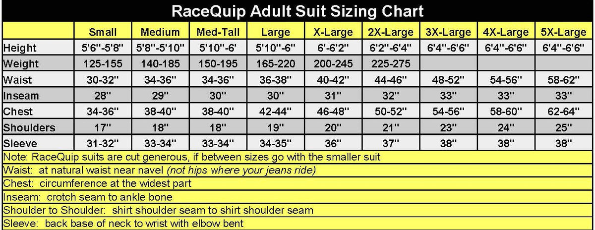 Q: What sizes are available for the RaceQuip Fire Suit?A: The RaceQuip Fire Suit is available in a range of sizes from Small to XXX-Large, ensuring a fit for various body types.