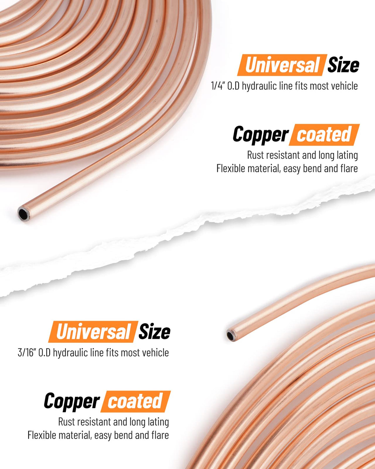 Q: What makes the Racewill Brake Line Kit more durable than standard options?A: The copper coating on the steel lines provides superior rust and corrosion resistance, making it a longer-lasting option compared to standard steel tubing, especially in harsh weather and environmental conditions.