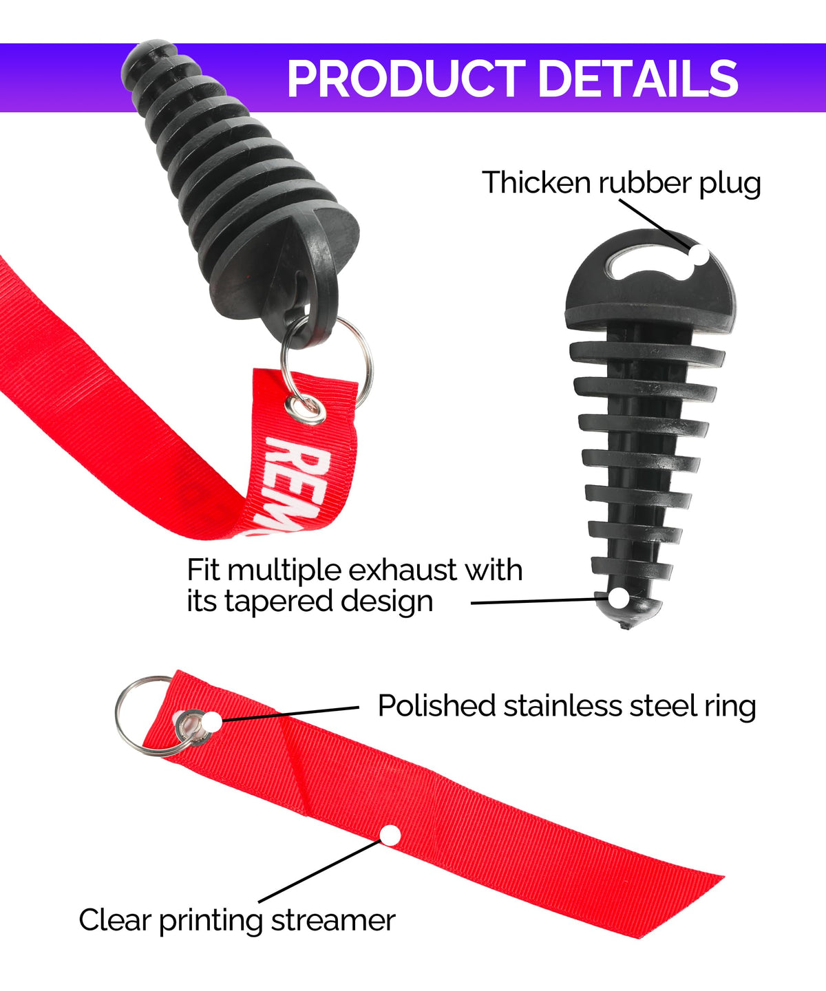 Specifications: < /b>0.6 ''-1.5'', 1.1 ''-1.8''< br > Material: < /b>Rubber< br > < br > What will you get in the box?< /b>< br > -2 x Muffler exhaust flushing plug< br > < br > Our product advantages:< /b>< br > -Made of new rubber with no odor and better toughness< br > -High temperature resistance, high-quality and durable, suitable for long-term use< br > -Equipped with a towing cable to remind you to remove the exhaust cleaning plug of the dirty bicycle muffler before departure< br > -Effectively sealing the exhaust pipe to ensure smooth and uninterrupted driving< br > -Suitable for most two-stroke motorcycles and bicycles< br >