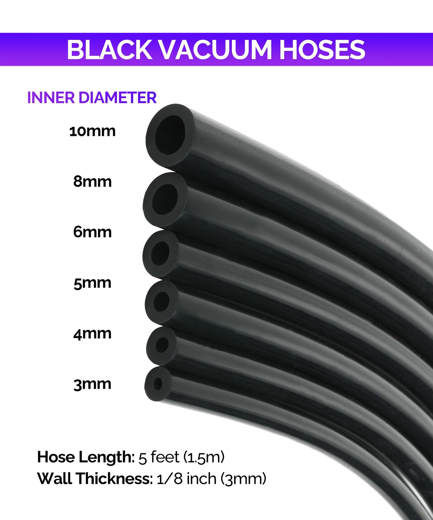 Q: What sizes of vacuum tubing are included in the RACOONA 6PCS Vacuum Silicone Tubing Hose kit?A: The RACOONA Vacuum Silicone Tubing Hose kit includes six different sizes of vacuum hoses with inner diameters of 3mm, 4mm, 5mm, 6mm, 8mm, and 10mm. Each size is designed to meet various automotive and vacuum needs.