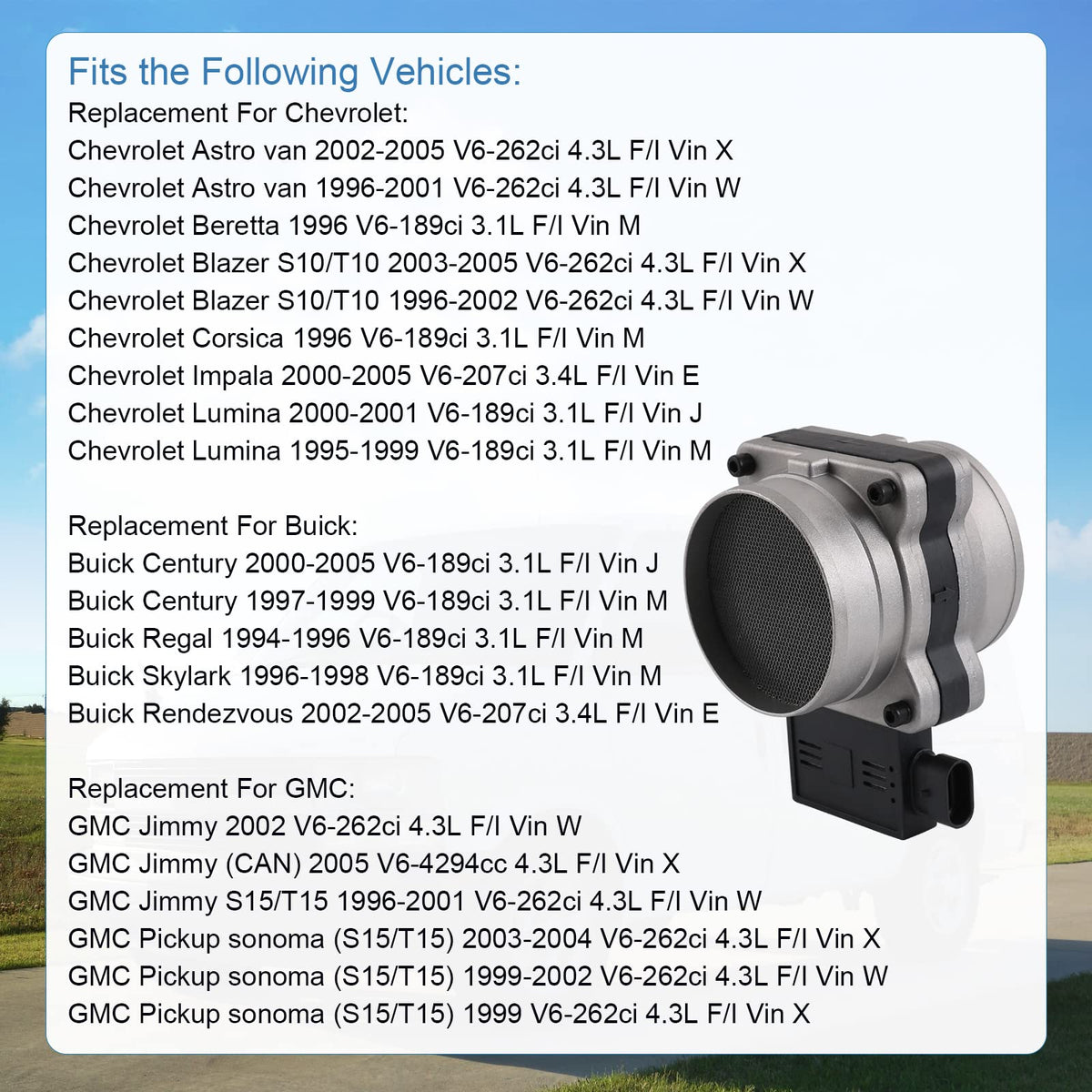 Q: What vehicles are compatible with the RADHLBNIU Mass Air Flow Sensor?A: The RADHLBNIU Mass Air Flow Sensor is compatible with various Chevrolet, GMC, and Buick vehicles including models like Chevy Astro (2002-2005), Blazer (1996-2005), Impala (2000-2005), GMC Jimmy (1996-2005), and Buick Regal (1994-1996). It is essential to check the specific engine specifications to ensure proper fitment.
