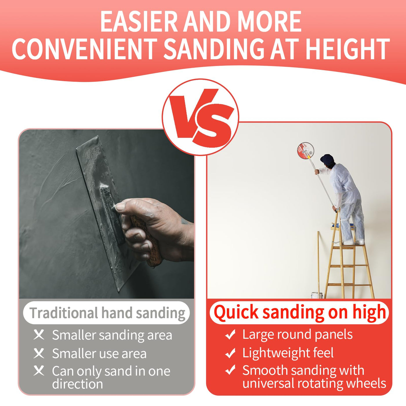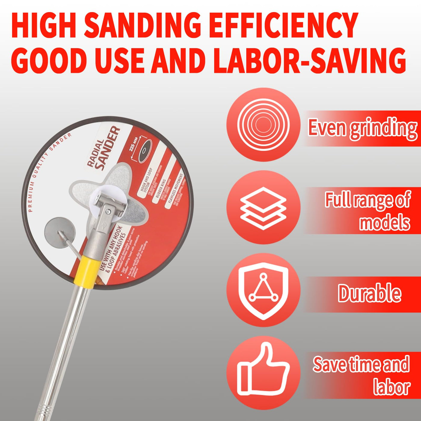 Q: Can I use this radial sander for ceilings and tall walls?A: Yes, the radial sander comes with an adjustable extension pole that extends up to 3.5 feet, allowing you to reach high walls and ceilings effortlessly. This makes it a great tool for projects that require sanding in hard-to-reach areas, ensuring a consistent finish without the need for ladders.