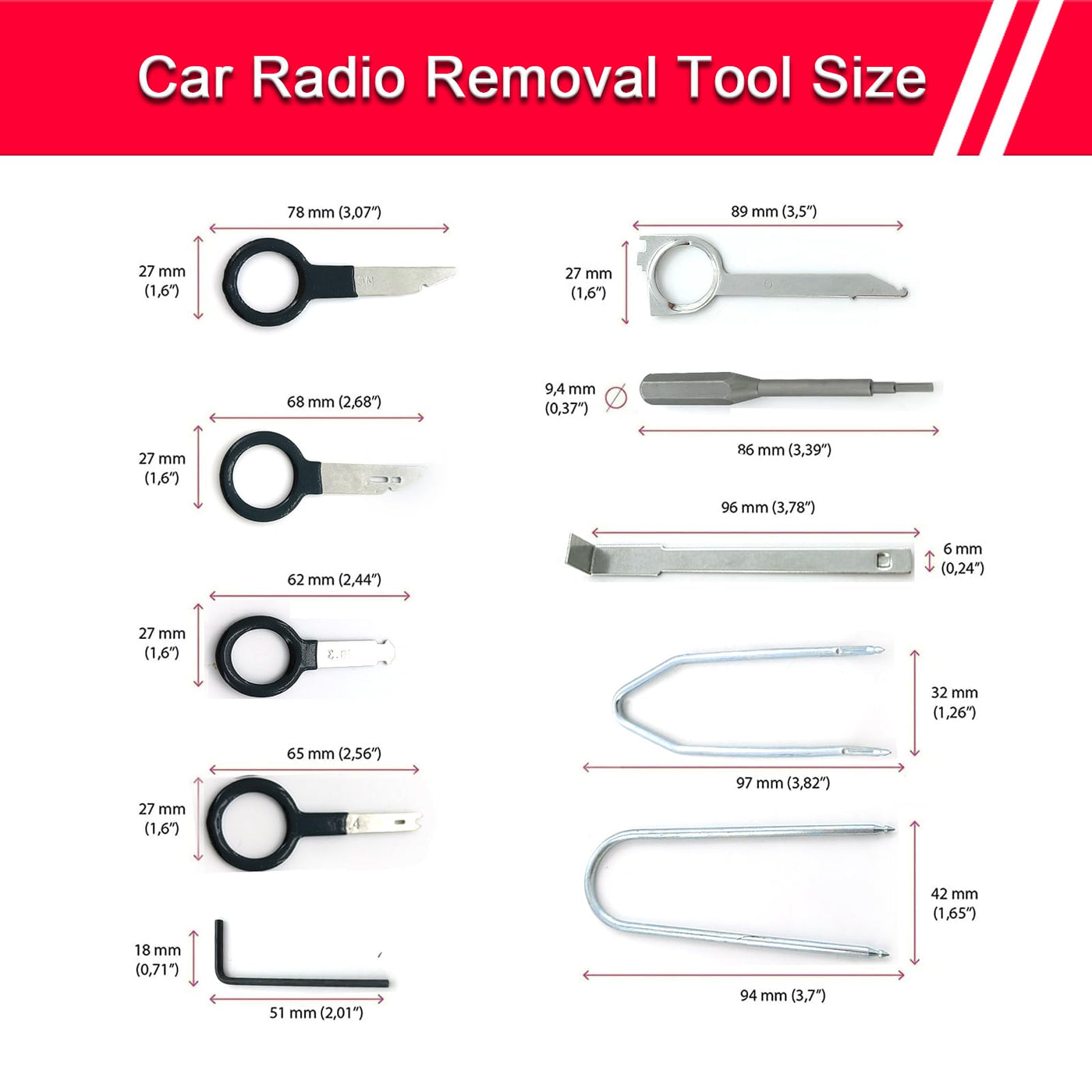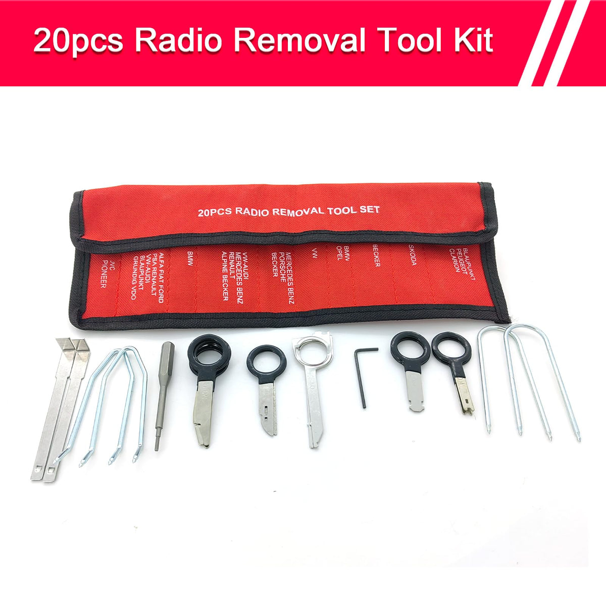 About our 20pcs Radio Removal Tool Kit Features: -Made of high-quality steel, durable and not easy to bend and break. - Designed to make the job much easier. - Designed to work on the theft-deterrent radio brackets. - Easily removes the radio without damaging the radio or the dash panel. -Used for dismantling or installing radio and navigation equipment, suitable for most cars and trucks. -Packed in a canvas bag which is durable easy to carry. Package Includes 4*Radio Removal U-Hooks 14*Radio Removal Keys 1*Special Pentagon Wrench 1*Allen Hex Wrench