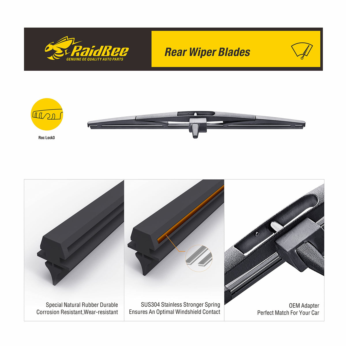 Q: What materials are used in the Raidbee Rear Wiper Blade?A: The wiper blade features a premium natural rubber material and a customized bending steel sheet, ensuring optimal contact with the windshield for effective wiping.