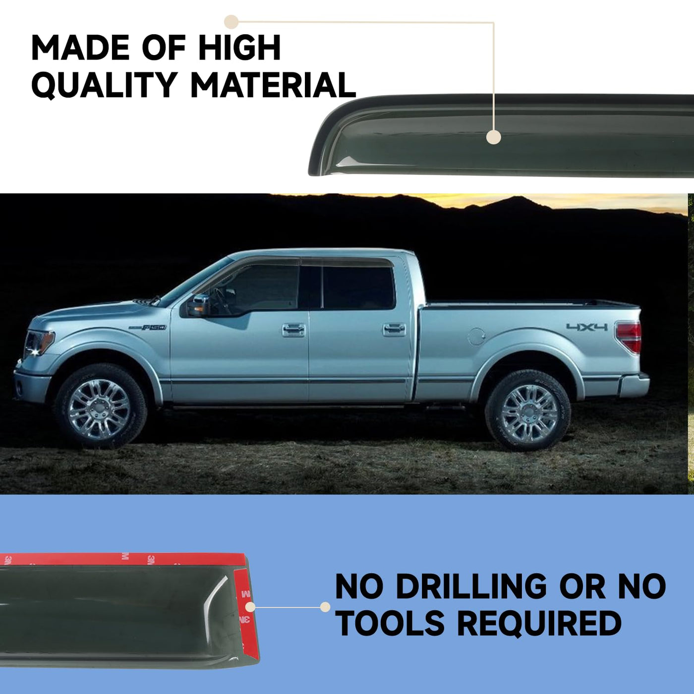 The rain guards fit for 2009-2014 Ford F150 SuperCrew Cab Truck car window construct with high-grade impact-resistant acrylic thats scratch resistant, car wash safe, and will never fade or discolor from exposure to the sun. You could enjoy the fresh air and keep the rain drops out after installing the vent visors window shade and keeping the window cracked open, no foggy worries.
