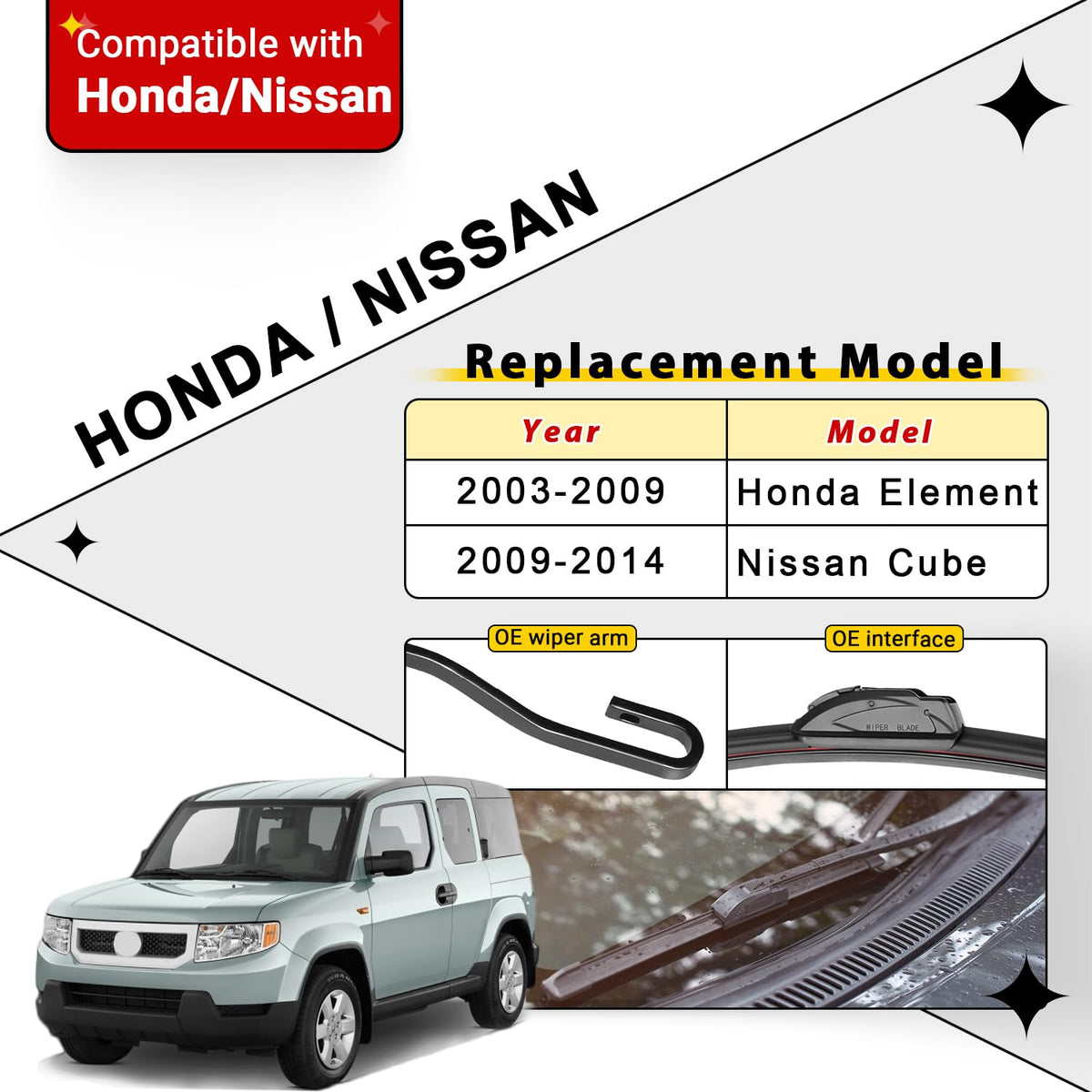 Q: What vehicles are compatible with the RAINTOK Windshield Wiper Blade Set?A: The RAINTOK Windshield Wiper Blade Set is designed to fit 2003-2009 Honda Element and 2009-2014 Nissan Cube models, ensuring an exact fit for optimal performance.