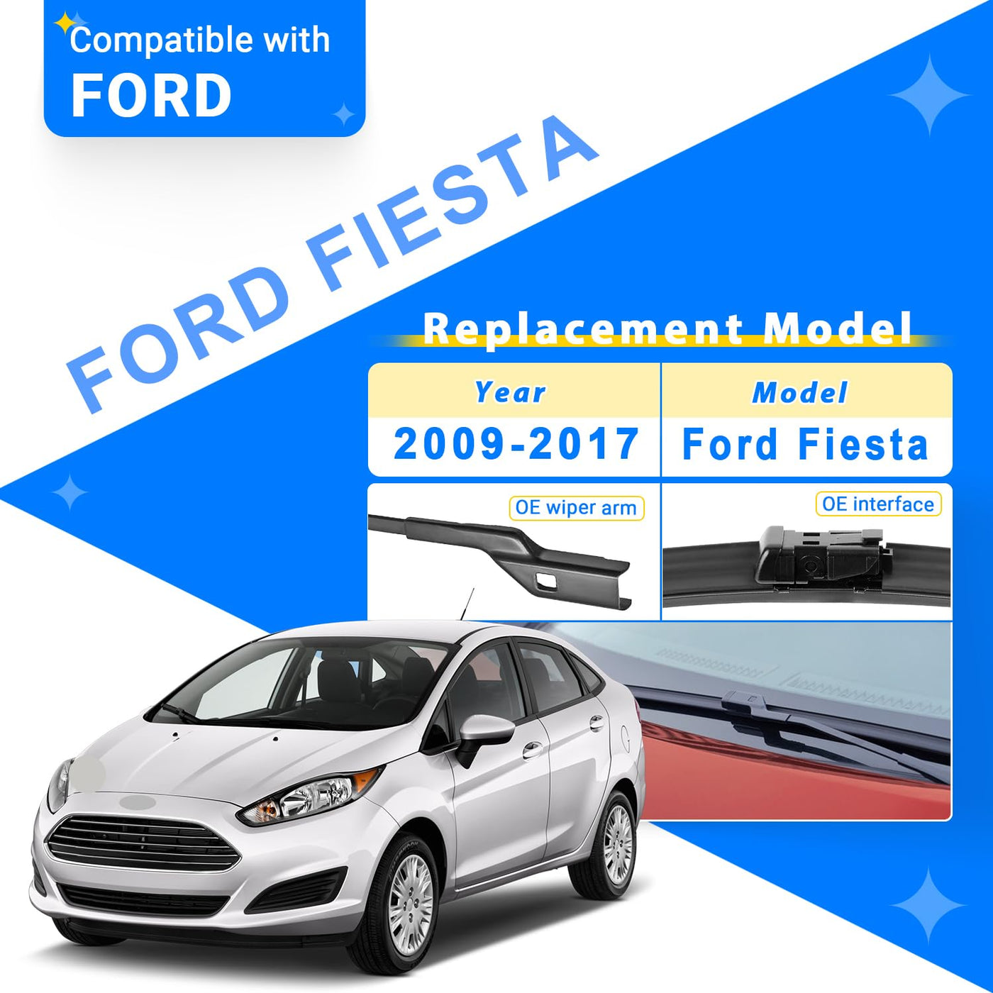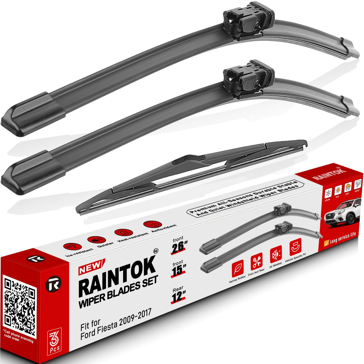 Q: What vehicles are compatible with the RAINTOK Windshield Wiper Blades?A: The RAINTOK Windshield Wiper Blades are specifically designed to fit 2009-2017 Ford Fiesta models, including the 26-inch front and 12-inch rear wipers.