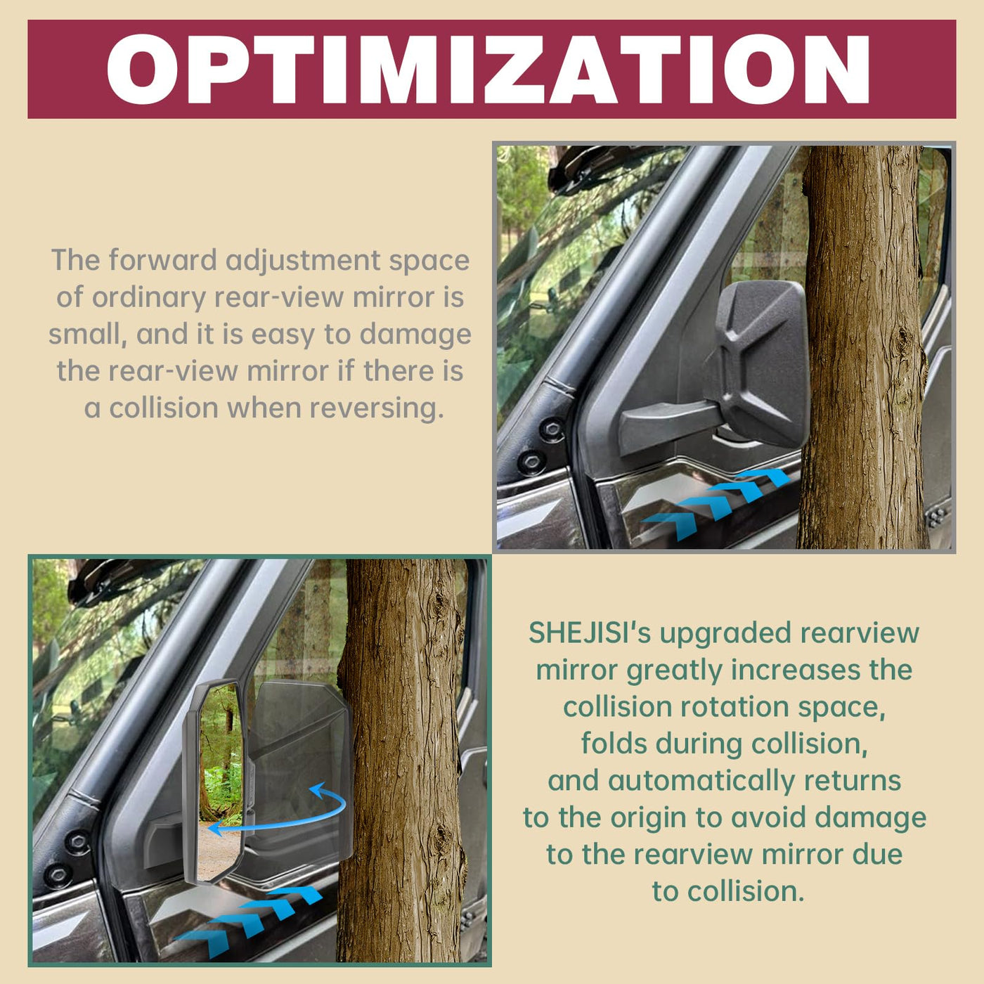 Q: What makes the SHEJISI Ranger Side View Mirrors unique?A: The SHEJISI Ranger Side View Mirrors feature a patented spring back design that allows for easy resetting after being folded, ensuring they return to their original position. This enhances the overall driving experience and safety, especially for UTVs with full doors.