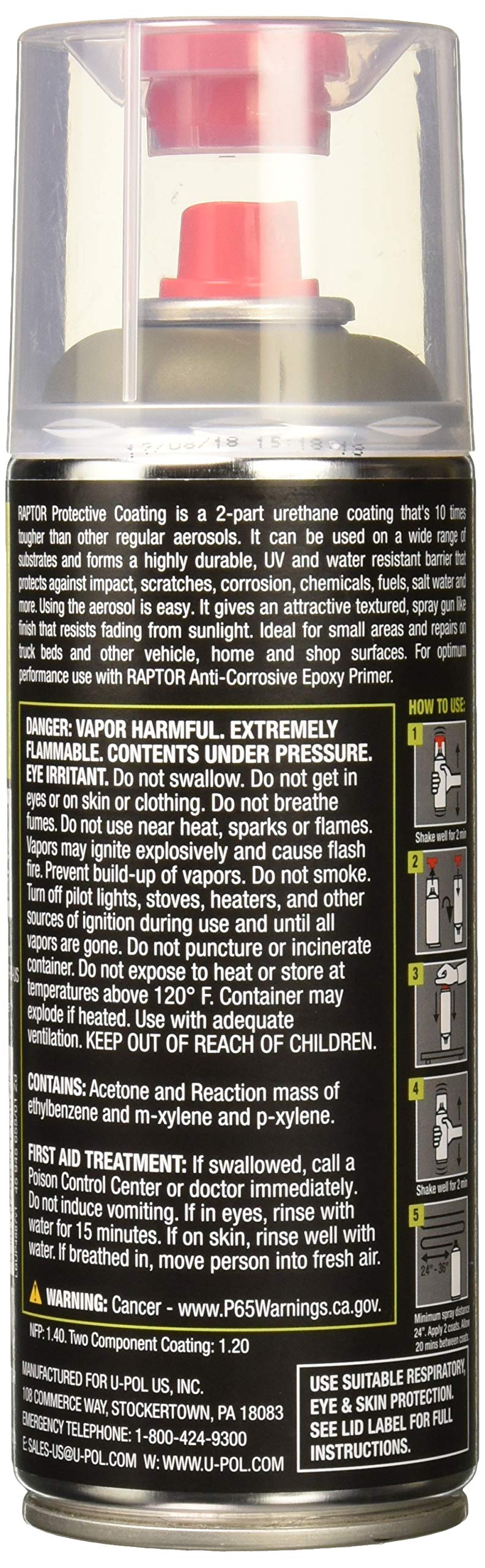 The convenient RAPTOR 2K Bed liner Aerosol offers a fast, easy way to apply RAPTOR without compromising performance, no spray equipment necessary. Ideal for spot repairs and small jobs. More than just a bed liner, RAPTOR is a highly durable and tough protective coating. Use RAPTOR on a variety of surfaces that need a protective barrier that withstands the toughest situations. Using RAPTOR is easy - Now you can spray RAPTOR 2K Bed liner Aerosol for a no mess, no clean-up application. It’s easy!